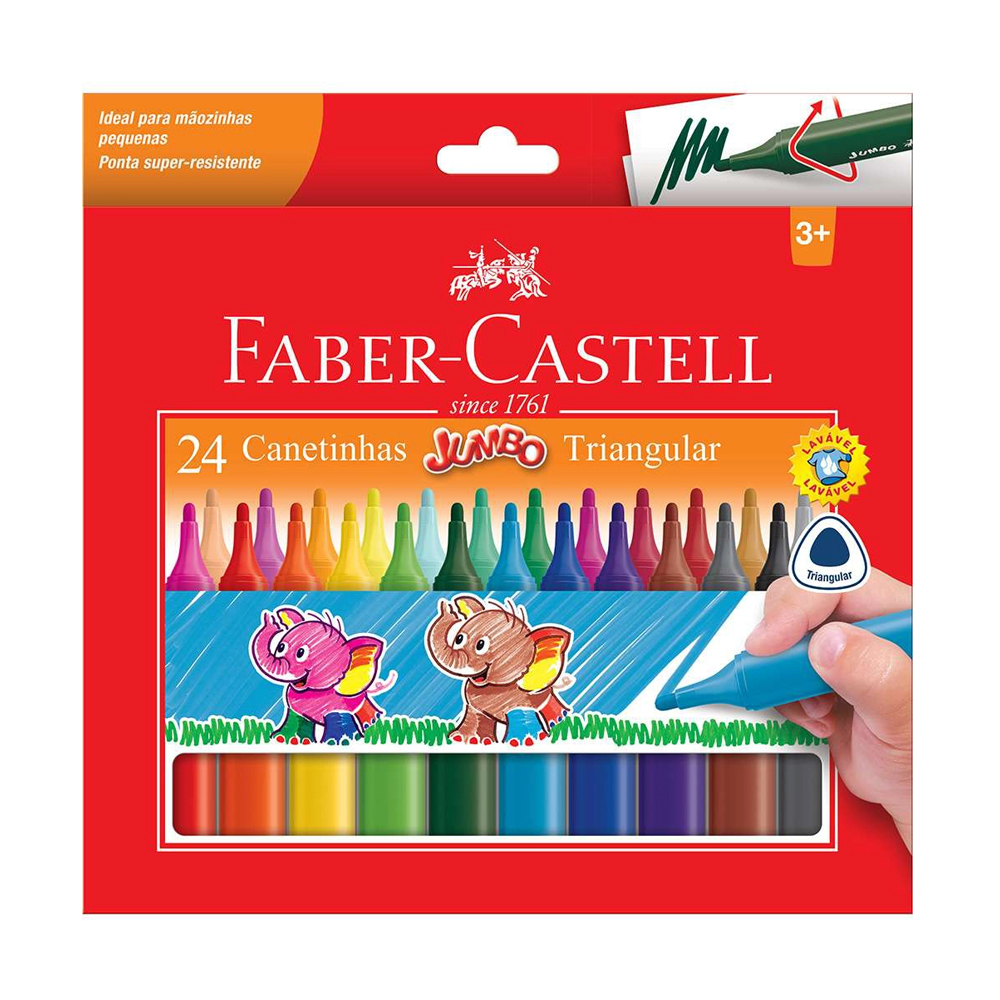 As canetinhas hidrográficas Faber-Castell da linha Jumbo estimulam a criatividade das crianças com a formulação exclusiva de corantes de alta qualidade com cores mais vivas. As canetinhas tem formato triangular ergonômico, ideal para mãozinhas pequenas. Sua ponta é super-resistente, a tinta é lavável e o produto é atóxico.