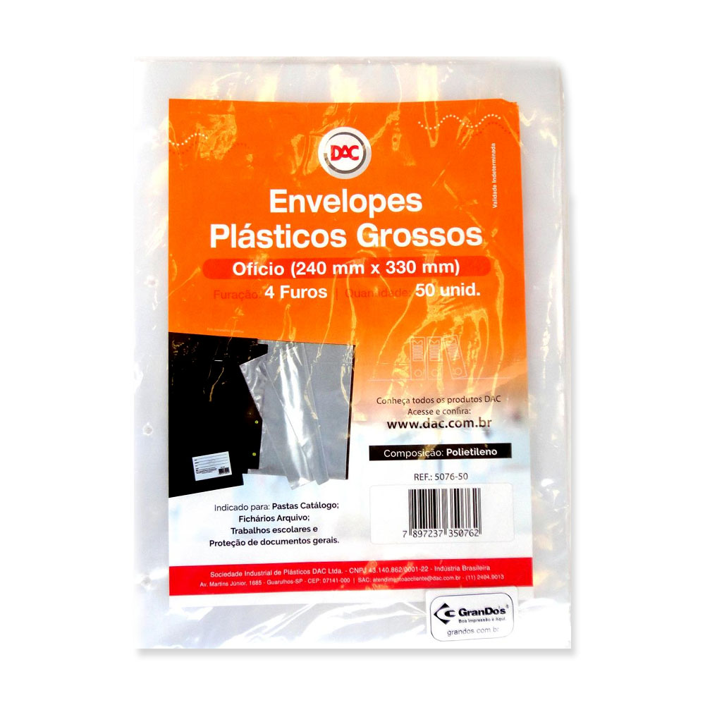 Envelopes plásticos grossos ofício dac, é ideal para você que precisa arquivar algum documento de forma organizada, e ainda conta com uma espessura de 0,14mm. - Com 50 envelopes - Medida da Peças 240 x 330 mm - Com 4 furos