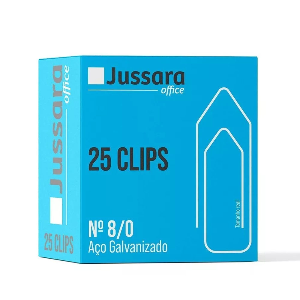 Clips para Papel 8/0 Jussara - 20 Unidades Indispensável na organização de folhas de papel, seja no escritório, na escola ou em casa. Acabamento brilhante com ótima proteção à oxidação. Características: - Quantidade: 25 - Tamanho: Clips Nº8 - Material: Aço Galvanizado.