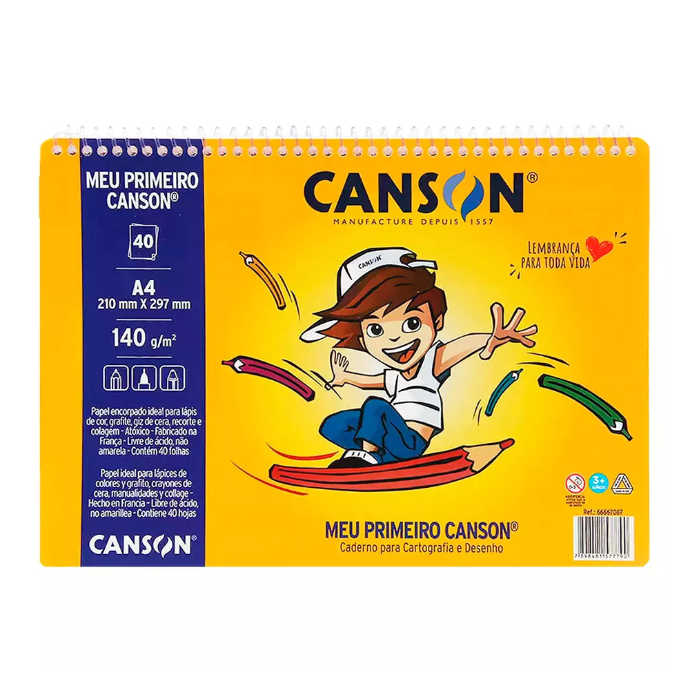 Meu Primeiro Canson® é o único caderno artístico escolar do Mercado! Possui o legítimo papel para desenho Canson® 140g/m² que permite ao aluno trabalhar com diversos materiais como; tintas, lápis de cor, giz de cera e colagens.