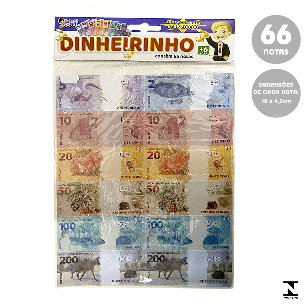 "Mini Dinheirinho De Mentira Brinquedo Educativo C/ 66 Notas Ideal para educar as crianças a lidar com o dinheiro, também pode ser utilizado para substituir o dinheiro dos jogos de tabuleiros, incluir dentro de lembranças de aniversário, festa junina, entre outras alternativas. Características: - Não precisa do uso de tesoura, as notas são pontilhadas, basta destacar; - Tamanho das notas: 10 x 4,2 cm; - Idade recomendada: para maiores de 6 anos; - Contém 66 notas; - Referência: 0806A; - INMETRO: CE-BRI/IQB 005772 NM 300/2002 -IMAGENS MERAMENTE ILUSTRATIVAS- ATENÇÃO: A COR DO PRODUTO PODE VARIAR DE ACORDO COM O MONITOR ATENÇÃO: O FABRICANTE PODE ALTERAR A COR DE ALGUMA PARTE DO PRODUTO SEM AVISO PRÉVIO. "