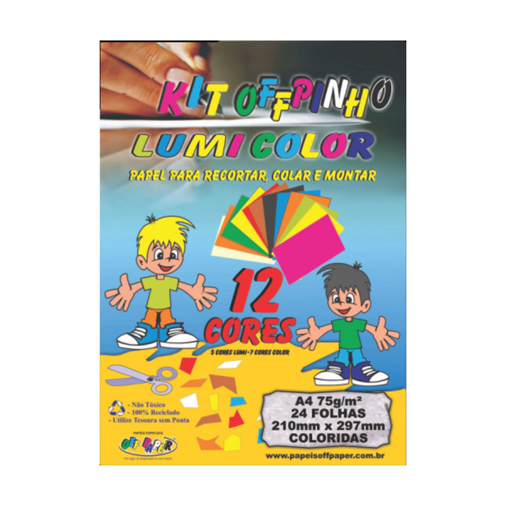 Junção da folhas Lumi e Color em um único pacote. Papel para recortar, colar e montar com 12 diferentes cores. Não tóxico. 100% reciclado. 2 cores de cada cor.