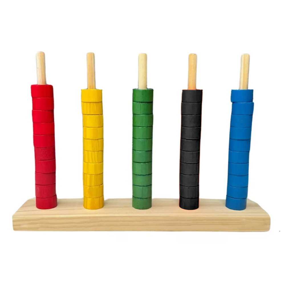 O Ábaco Aberto é confeccionado em base de madeira, com marcação de Unidade, Dezena, Centena, Unidade de Milhar e Dezena de Milhar, FRENTE E VERSO e cinco hastes contendo 50 madeiras coloridas, para auxiliar a criança no processo de abstração do conceito de quantidade.