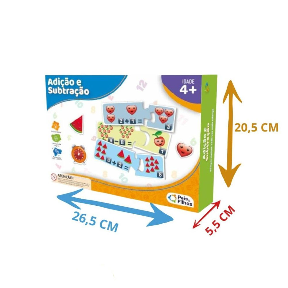 Jogo Educativo Adição e Subtração 72 Peças Pais e Filhos Cada quebra cabeça é formado por duas peças, onde o objetivo é encaixar a operação matemática com o seu resultado correto. Auxilia o aprendizado das operações matemáticas de adição e subtração. A criança aprende matemática brincando! Indicado para crianças a partir de 4 anos. Caixa contendo 72 peças ilustradas. Participantes de 2 a 4 Atenção: Imagem Ilustrativa, cores podem ser diferentes devido a imagem. Não nos responsabilizamos por alteração de embalagem, cores e acessorios sem aviso prévio do fabricante.