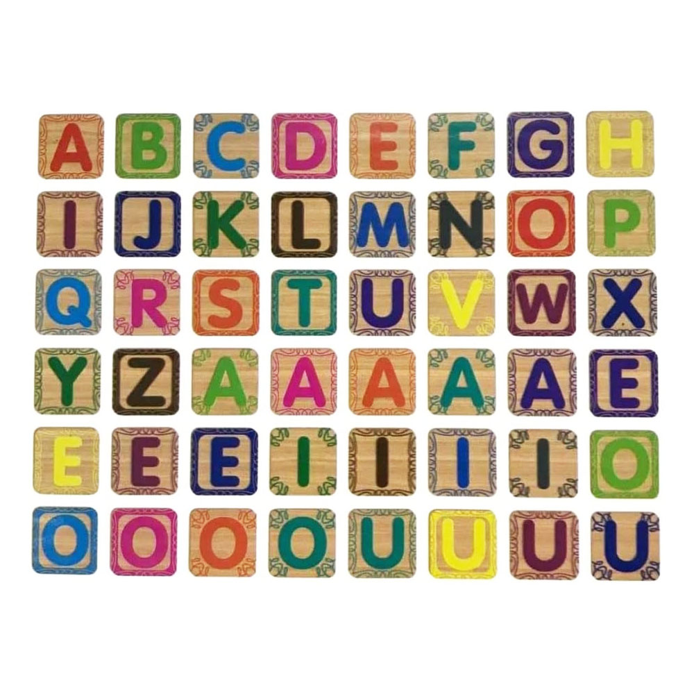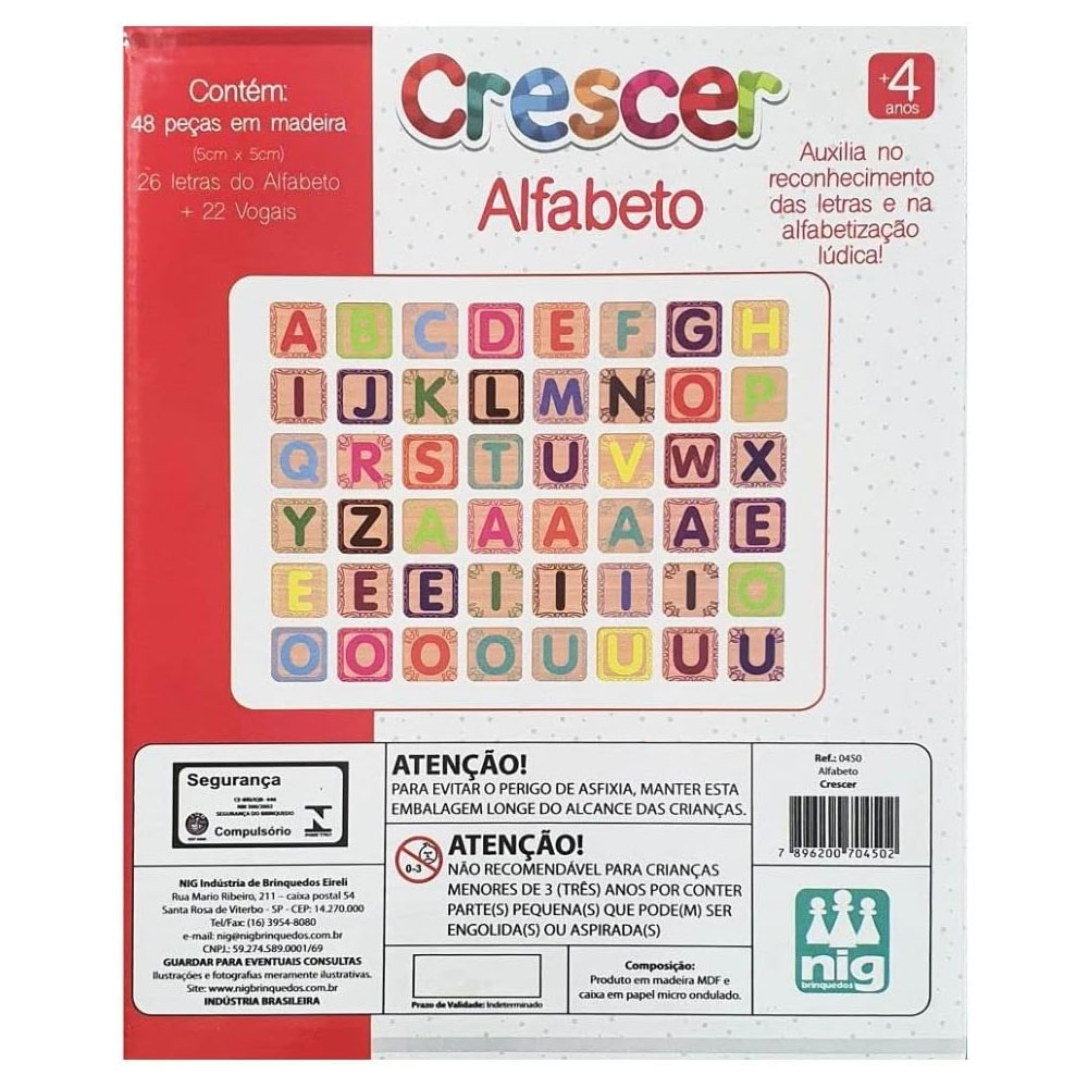 Contém 48 letras em madeira: 26 letras do alfabeto + 22 vogais