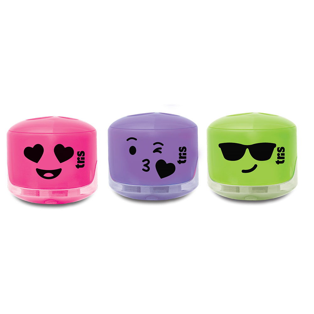 O apontador com depósito Emotion possui 2 furos: para lápis normal e jumbo! Com 6 carinhas divertidas Sortidas e lâmina antiferrugem super reforçada, que aponta até 3x mais!* Dimensões: 3,8×3,8×3,6cm. Cores sortidas.*em comparação aos apontadores tradicionais TRIS.