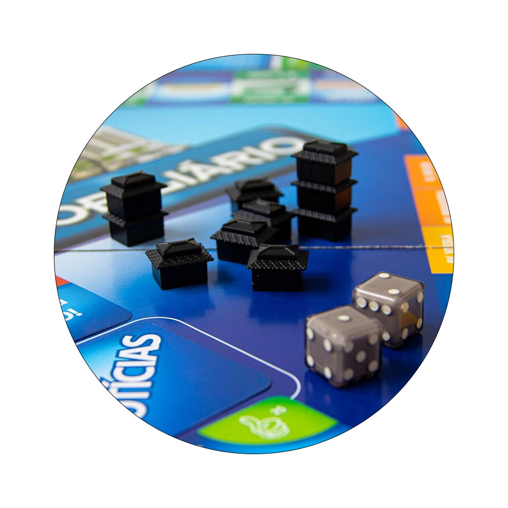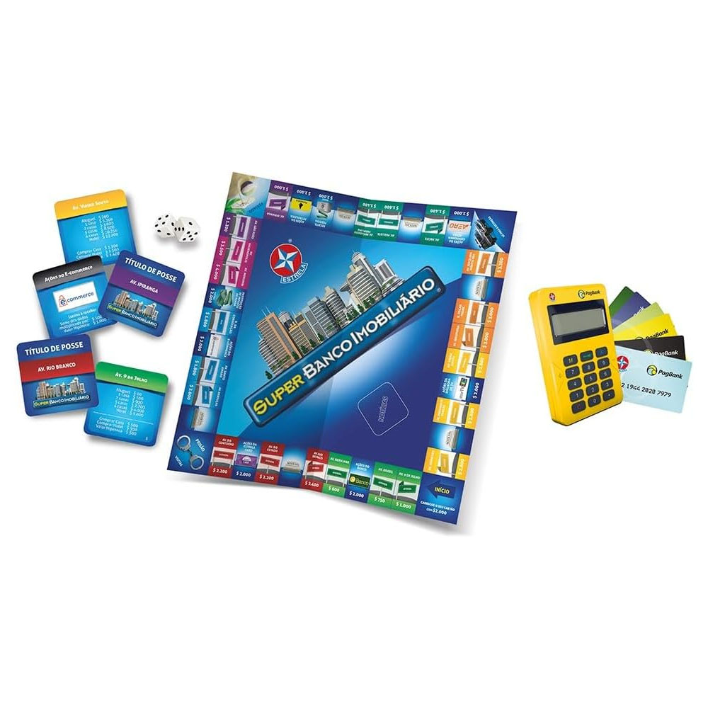 Super Banco Imobiliário Estrela Nessa versão do Banco Imobiliário você tem a possibilidade de realizar os pagamentos utilizando a máquina de cartões! Você vai ter que provar que é bom nos negócios! O tabuleiro é dividido em 4 partes. Contém na embalagem: 1 tabuleiro, 28 títulos de posse, 6 cartões, 80 casas, 2 dados, 6 marcadores de metal, 1 máquina de cartão (pilhas não inclusas) e 1 manual de instruções. INMETRO 001820/2020