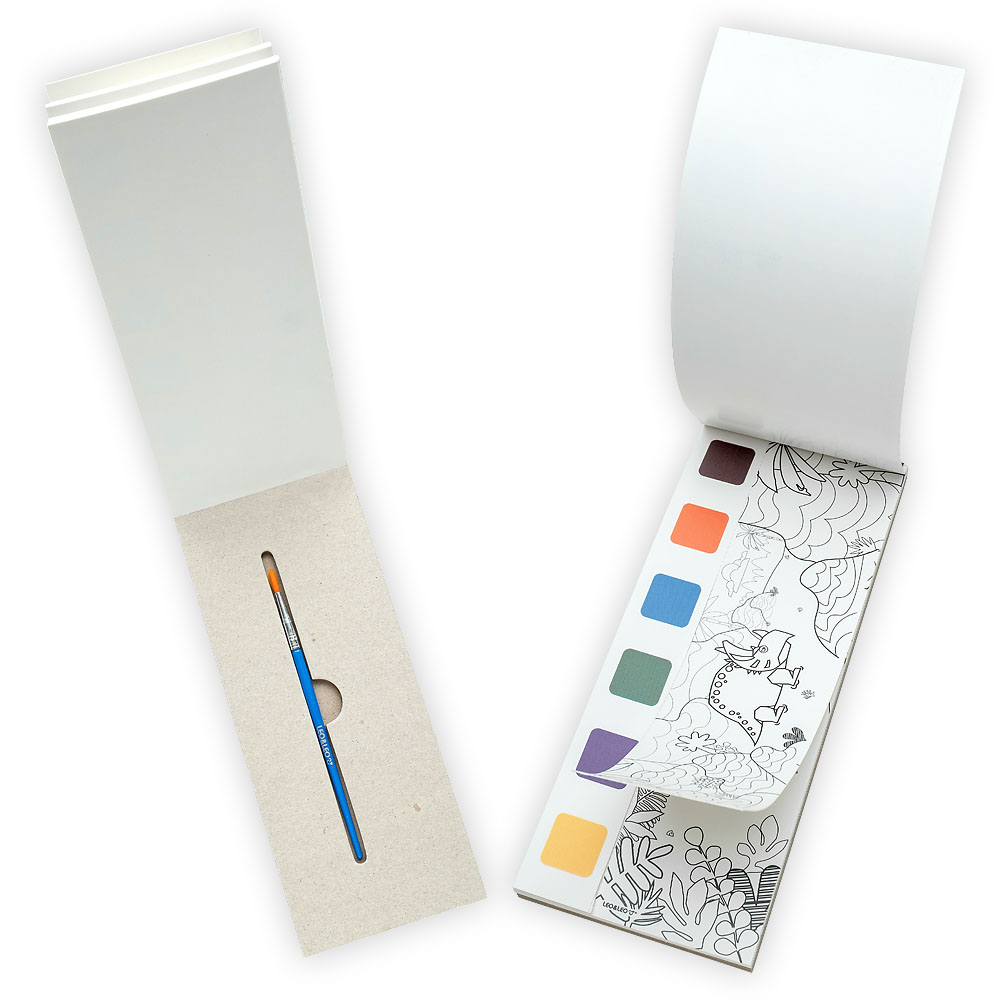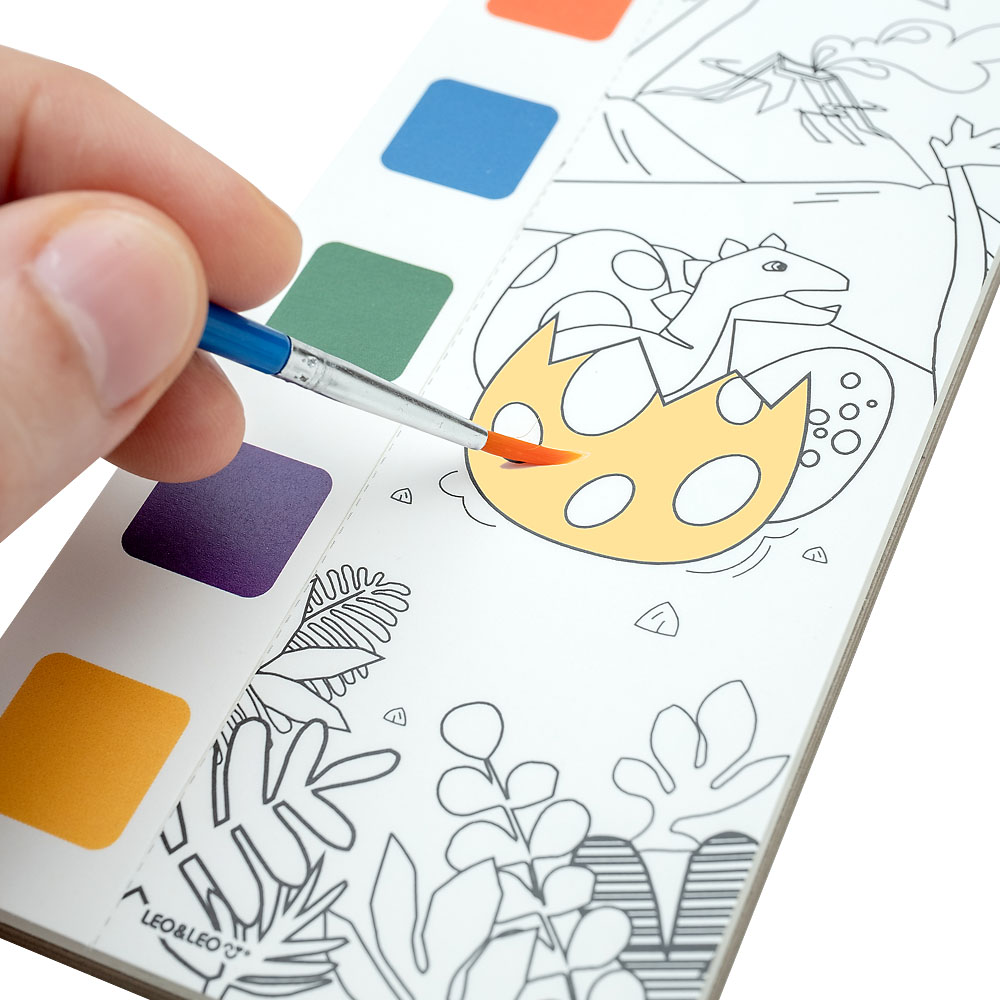 São 12 desenhos exclusivos para colorir que estampam lindas ilustrações que retratam de forma lúdica os queridos animais pré-históricos e o ambiente onde viviam os dinossauros. Ele é um kit completo para pintura, sendo que cada folha vem com 6 pastilhas de aquarela ideal para pintar o desenho nas cores amarelo, laranja, rosa, roxo, azul e verde. As pastilhas de aquarela são destacáveis e o kit ainda acompanha pincel.