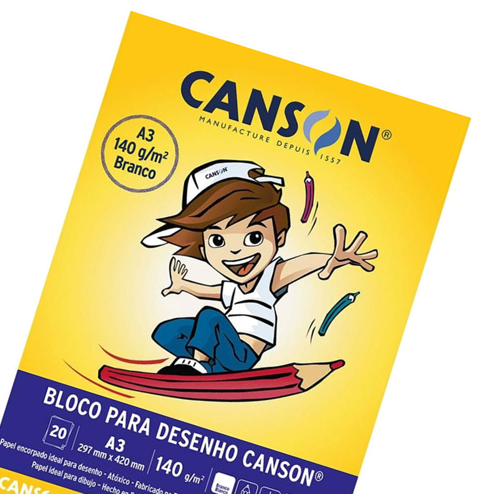 O Bloco Escolar Desenho Branco é o verdadeiro papel Canson, utilizado nas aulas de Educação Artística e Pintura para crianças em fase de aprendizagem. Levemente texturado e colado na massa, é indicado para lápis de cor, giz de cera e técnicas úmidas com pouca água.