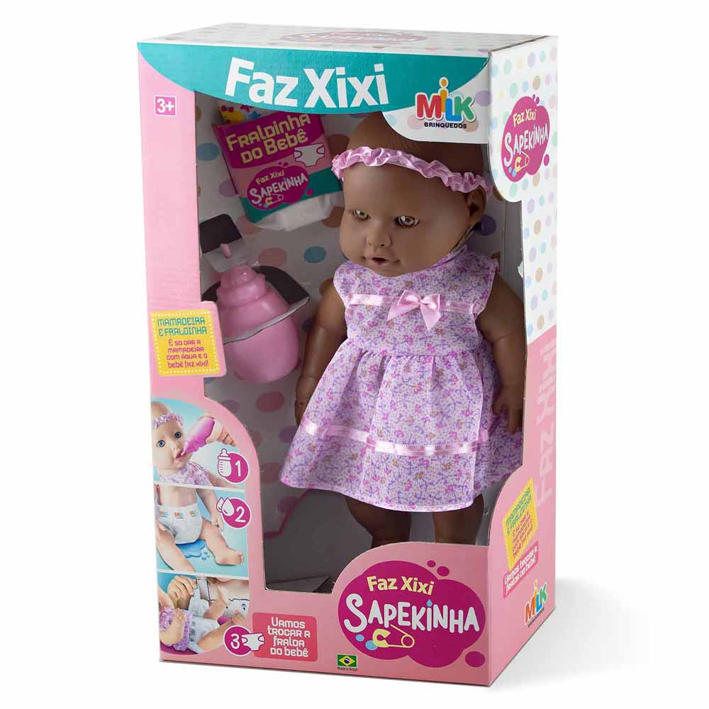 Conteúdo da Embalagem: 1 Boneca Sapekinha Faz Xixi + 1 mamadeira + 1 fralda