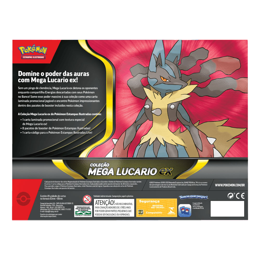 Domine o poder das auras com Mega Lucario ex! Sem um pingo de clemência, Mega Lucario ex detona os oponentes enquanto compartilha Energias descartadas com seus Pokémon no Banco! Some esse poder massivo à sua coleção como uma carta laminada promocional jogável e encontre Pokémon impressionantes dentro dos pacotes de boosters incluídos nesta coleção.