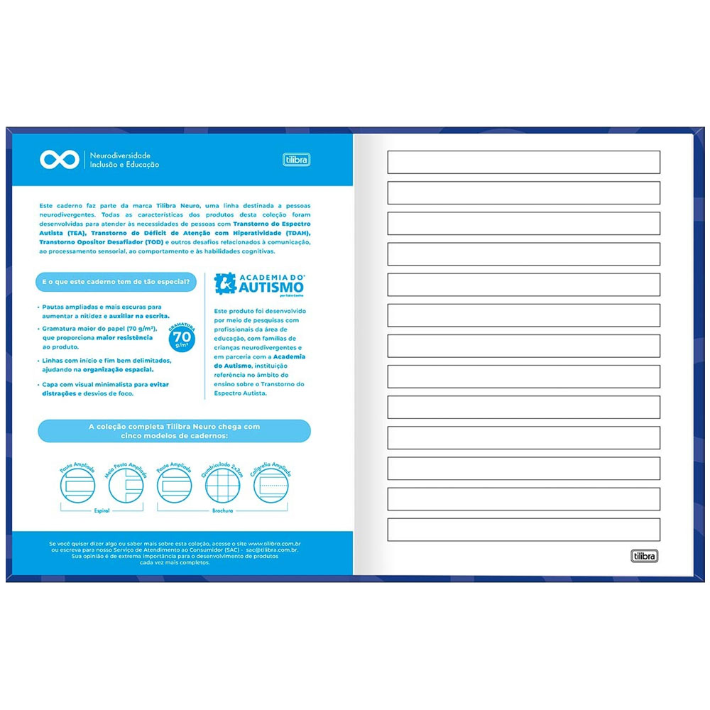O Caderno Pauta Ampliada Brochura Capa Dura Tilibra Neuro 80 Folhas possui capa dura e folhas com espaçamento maior que as linhas convencionais. Esse produto faz parte da coleção Tilibra Neuro, desenvolvida por meio de pesquisas com profissionais da área de educação, famílias atípicas e parceria com a Academia do Autismo.