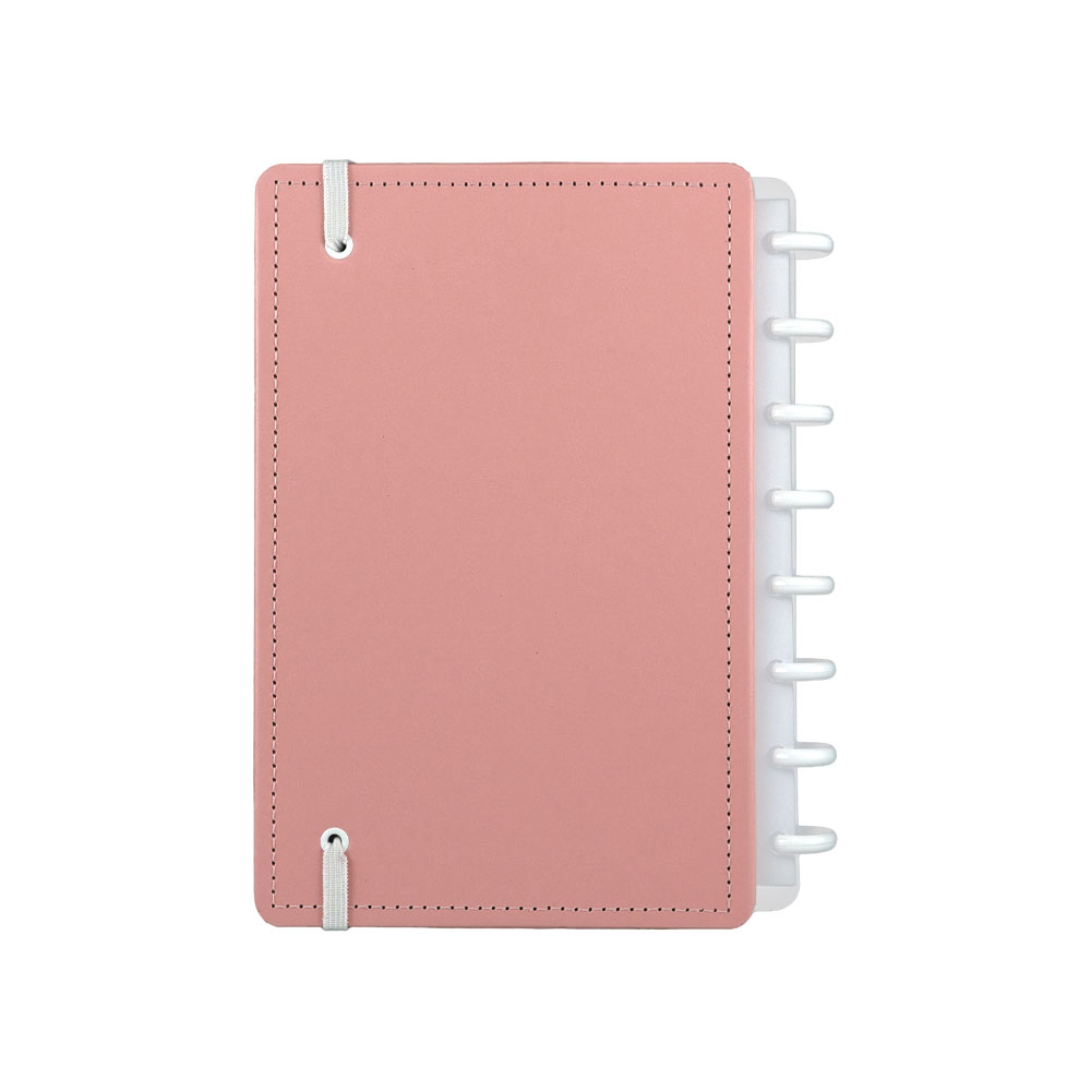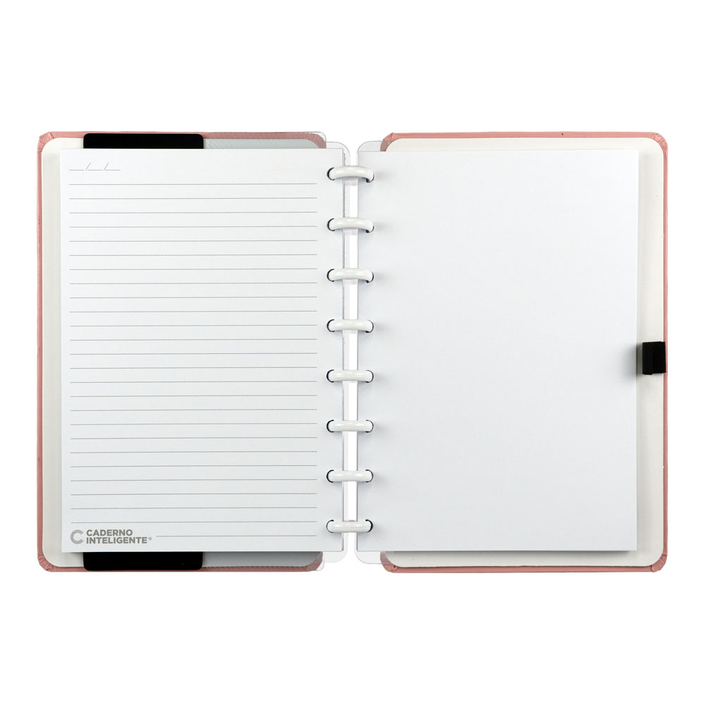A5 : Capa e contracapa rígidas, 01 bolsa plástica, 01 folha de instrução de uso e manuseio, com refis e acessórios da marca disponíveis no verso, 01 folha de identificação com calendário no verso, 04 divisórias com abas para identificação (02 pretas e 02 transparentes), 80 folhas offset 90g (60 folhas pautadas e 20 folhas lisas brancas para impressão), 01 suporte com elástico para 01 caneta ou 01 lápis e discos M + elástico. Um pouco maior que seu irmão Inteligine, o A5 é exatamente o que o nome promete: metade de uma folha sulfite (A4). Ele traz mais espaço para você escrever, desenhar, rabiscar, mas sem ocupar um espação na mochila. Medidas: 155x220mm.
