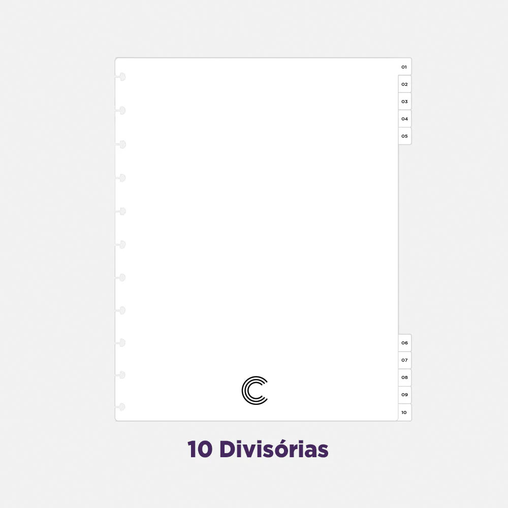 Organização: 10 divisórias com abas + página de índice para divisória.