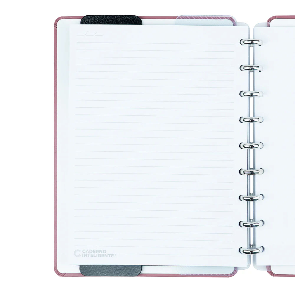 O modelo possui capa dura com acabamento percalux, que imita a textura de um couro sintético, discos metalizados com o centro transparente e elástico do mesmo tom da capa. É o match perfeito para quem gosta de funcionalidade e praticidade sem deixar o estilo de lado.