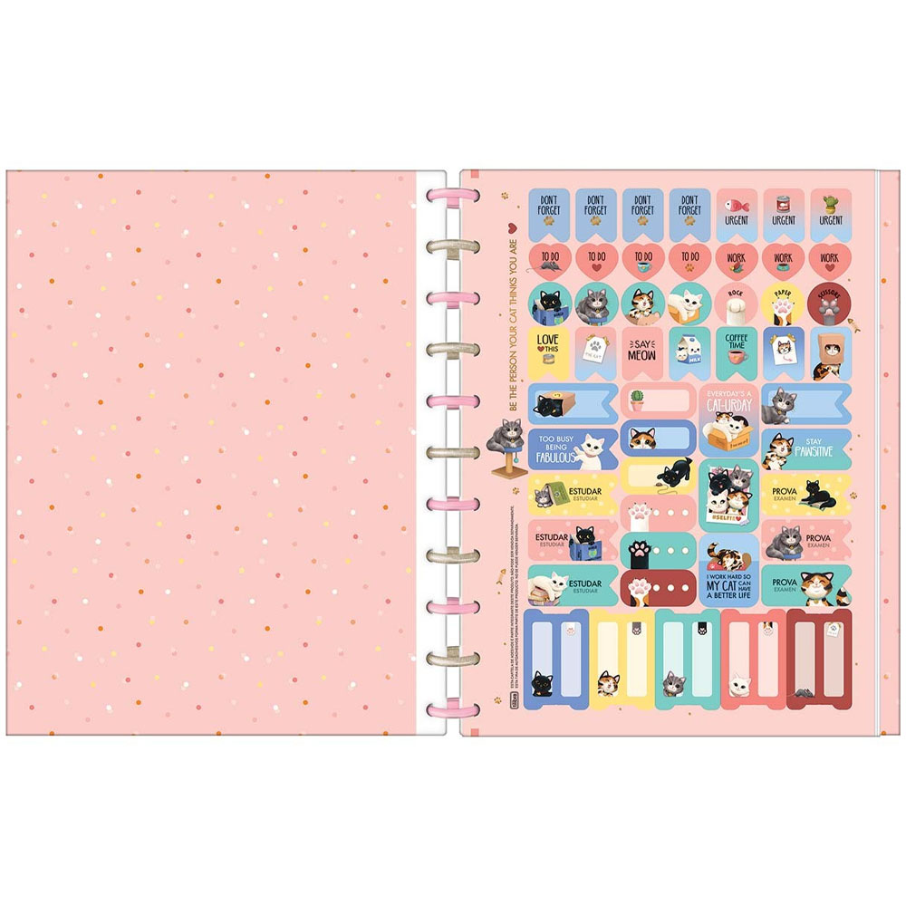 O Caderno Universitário Tilidisco 10 Matérias Purrfect Cats 160 Folhas garante a liberdade para você se organizar como bem entender. O produto é desenvolvido com capa dura removível, 11 discos coloridos, bolsa plástica, índice, separador de matérias, adesivos para decorar e miolo pautado com 160 folhas, de 90 g/m², soltas que podem ser tiradas e adicionadas quantas vezes quiser.