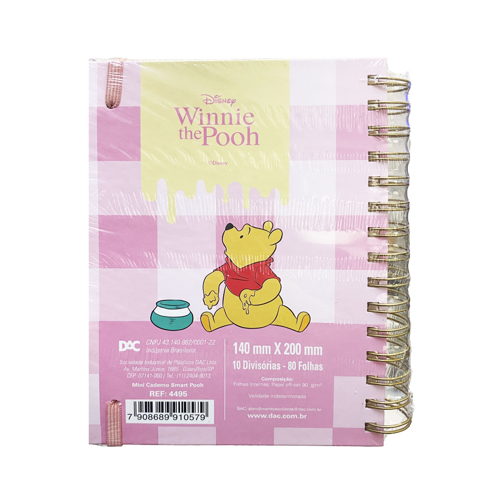 O Caderno Smart Mini do Ursinho Pooh em Wire-o é lindo, sofisticado e muito resistente, pois o espiral é de metal grosso e totalmente fixo com a capa. O elástico impede das folhas ficarem balançando ou com o risco de cair e desmontar.