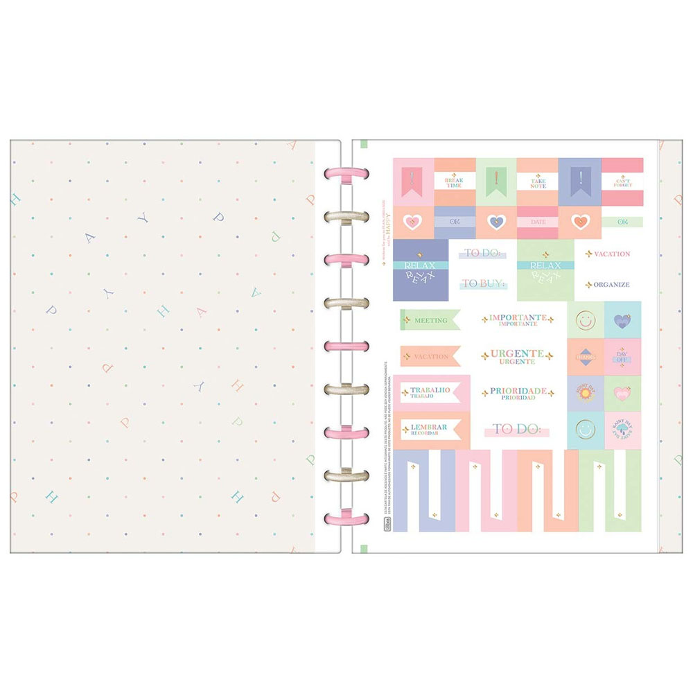 O Caderno Tilidisco Colegial 10 Matérias Happy 160 Folhas é o caderno de discos da Tilibra com visual em cores pastel. O produto é desenvolvido com capa dura removível, 9 discos, bolsa plástica, índice, separador de matérias, adesivos para decorar e 160 folhas de 90 g/m², que podem ser tiradas e adicionadas, quantas vezes quiser, para anotar as aulas, fazer resumos, listar tarefas e organizar as ideias de forma prática e eficiente.