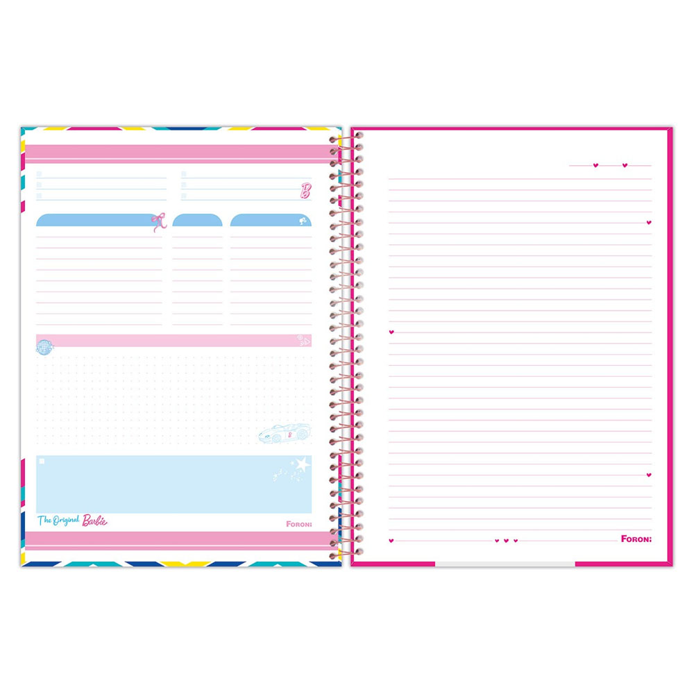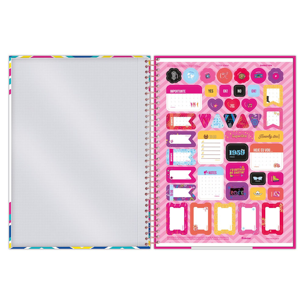 O Caderno Universitário Capa Dura Barbie Teen expressa a tendência fashion, lifestyle e muita diversão. Busca retratar cores alegres e a própria personagem em todas as suas capas.