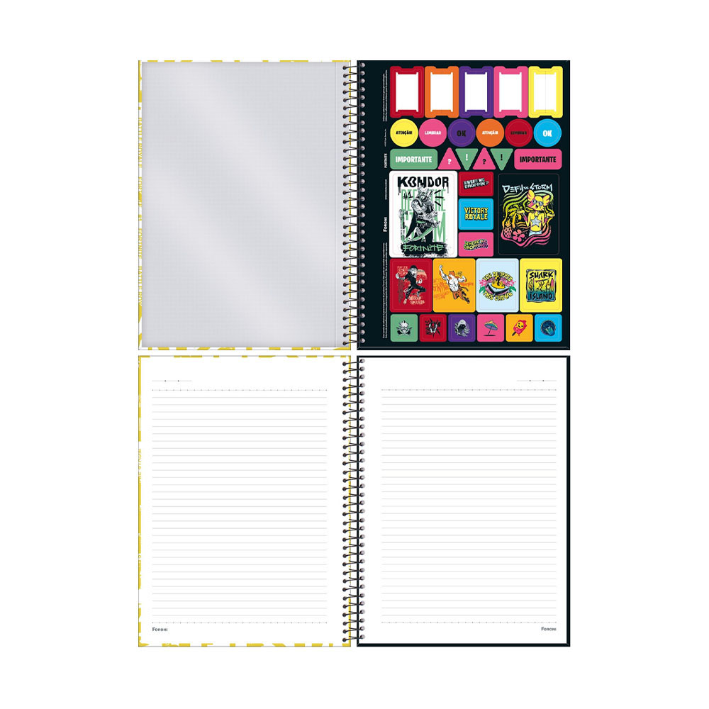 O Caderno Universitário Capa Dura Fortnite busca retratar o game através de suas 8 opções de capas – um jogo de combate entre 100 jogadores que combina criação, diversão e muito humor.