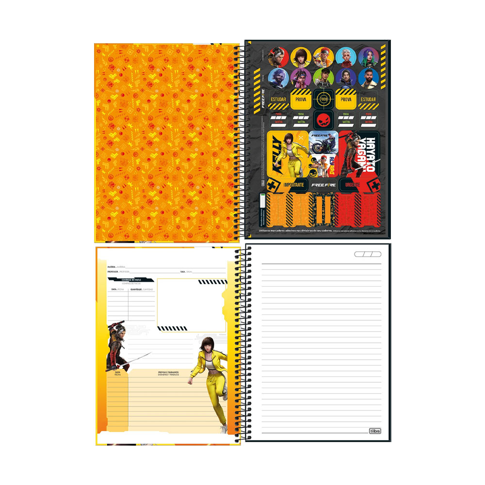 O Caderno Espiral Capa Dura Universitário 1 Matéria Free Fire 80 Folhas possui capa dura com a parte interna decorada, bolsa plástica para guardar trabalhos e anotações, folha com adesivos funcionais, folhas pautadas e espiral colorido. Ideal para o dia a dia na escola ou na faculdade