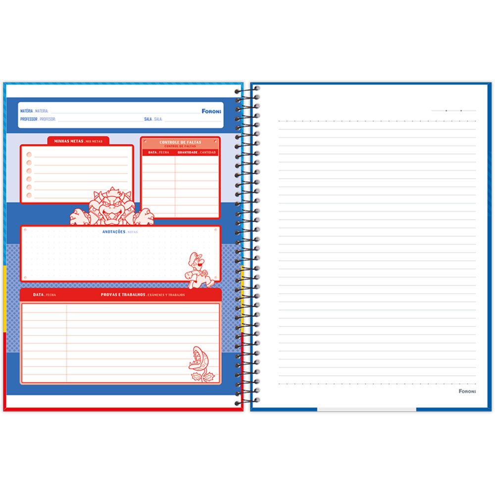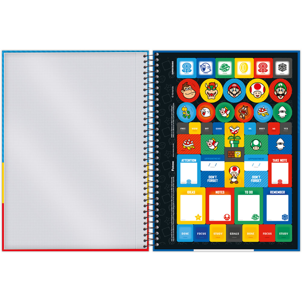 Entre no mundo aventureiro de Mario e seus amigos com a coleção Super Mario Bros da Foroni. Combinando funcionalidade com o divertido universo dos clássicos jogos de videogame, este caderno é uma adição essencial para fãs de todas as idades que desejam incorporar um pouco da magia do mundo de Mario ao seu cotidiano acadêmico ou profissional.