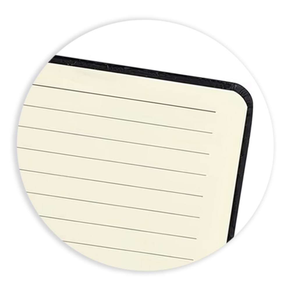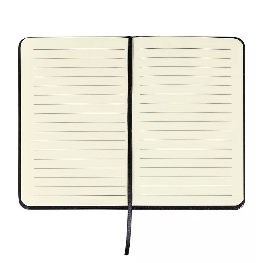 Capa de papelão rígido com acabamento emborrachado, folhas pautadas e fechamento em elástico.