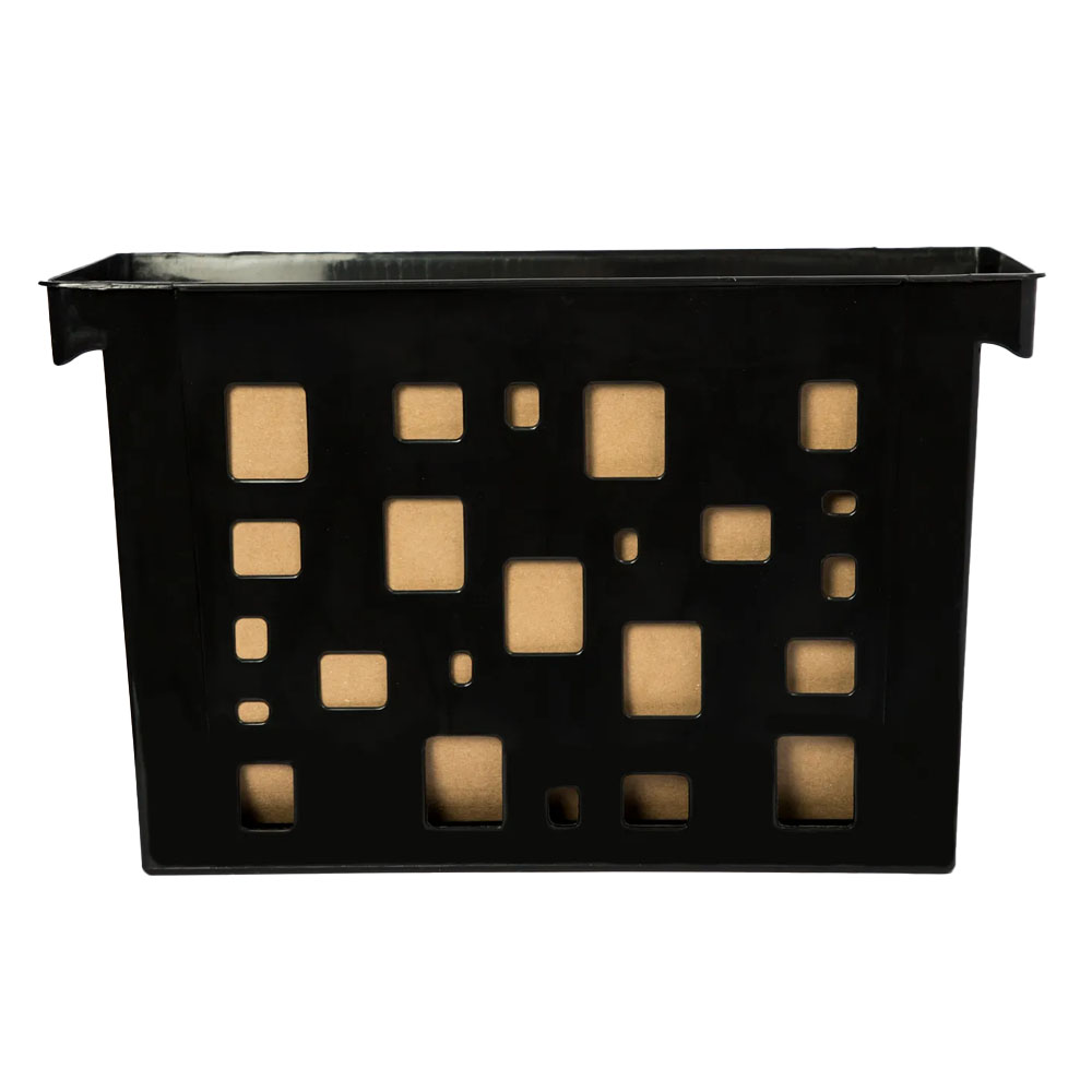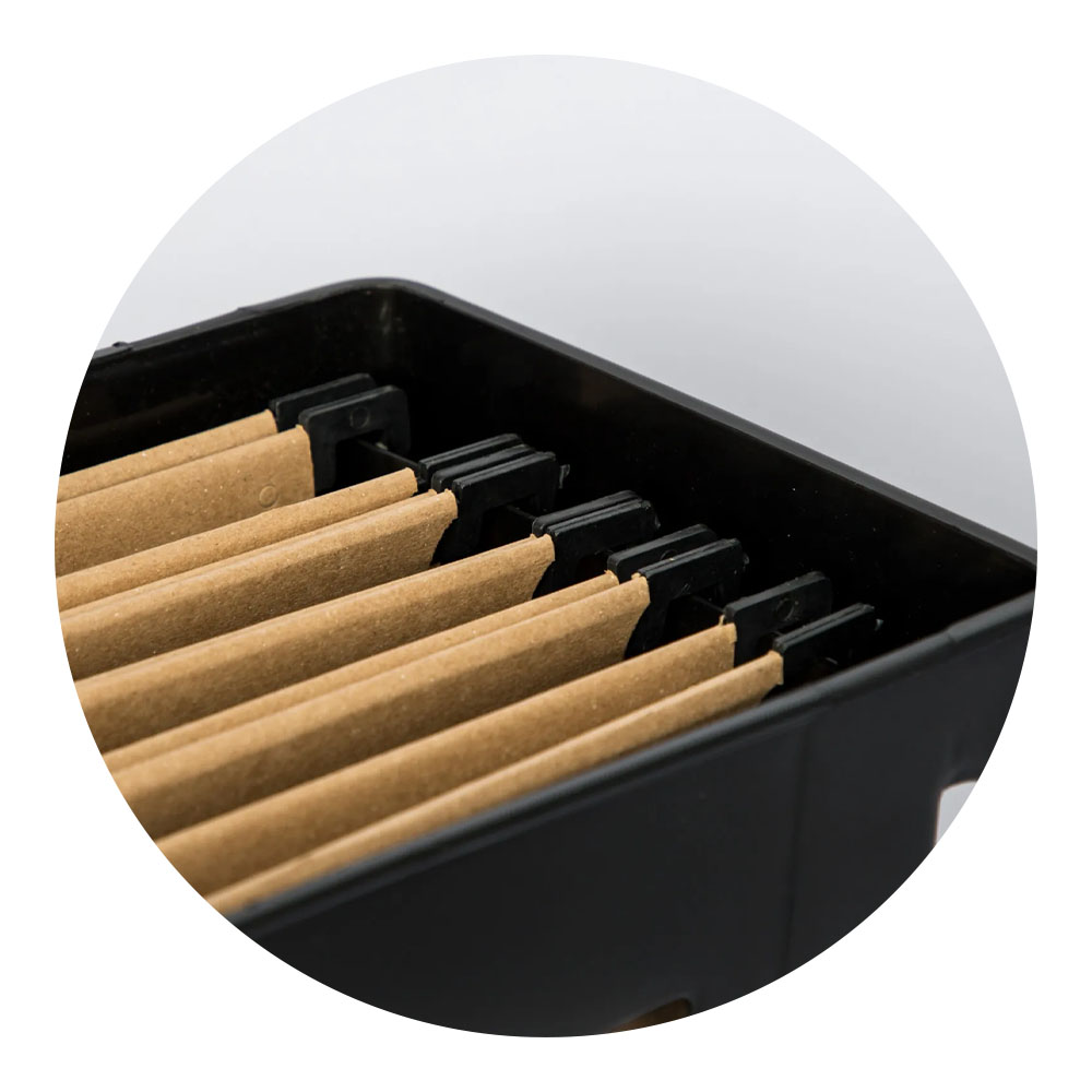 Pasta tamanho ofício, feita de polipropileno, com 6 pastas suspensas de papel kraft. Inclui prendedor de plástico, abas e divisórias. Dimensões : 440 × 180 × 270 mm.