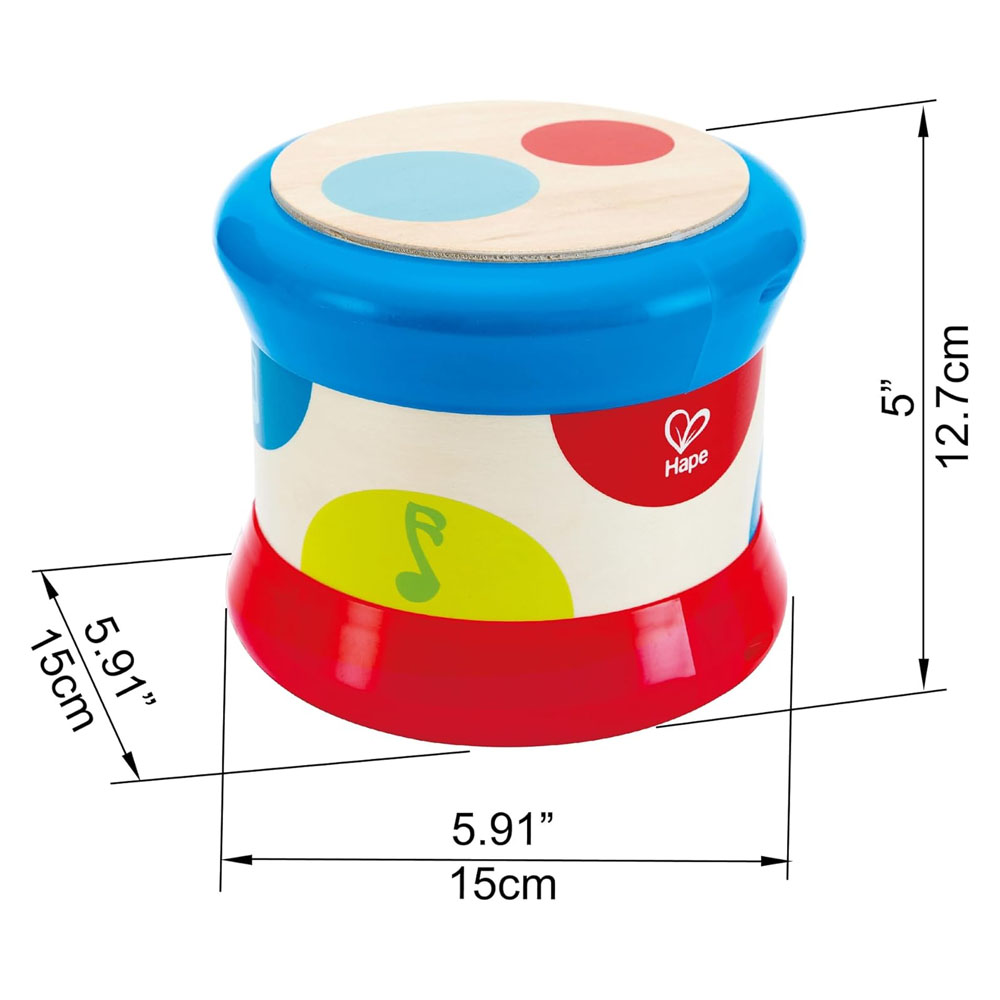 Quando colocado no chão e enrolado, o Baby Drum emite uma melodia de bateria funky e inicia automaticamente um show de luzes deslumbrante. A melodia difere quando é desligada e irá parar automaticamente quando parada. Quando parado, o Baby Drum pode ser batido como um tambor, com cada círculo colorido emitindo um som de tambor diferente e acionando uma luz de cor diferente quando tocado. Incentiva as crianças a explorar a música e o ritmo, a engatinhar e a desenvolver as suas capacidades de coordenação olho-mão. O modo de economia de energia é ativado automaticamente se for deixado inativo por mais de dois minutos.