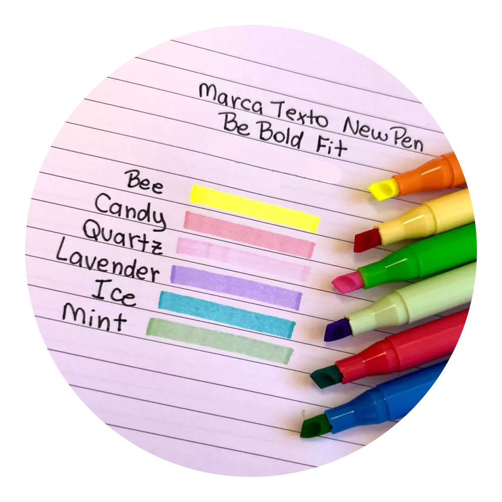 A Caneta Marca-Texto Be Bold Fit tem a ponta chanfrada e flexivel. Ela tem uma longa duração, não secando mesmo destampada por até 24h. Tinta de alta pigmentação à base de água, além de ser perfumada.om a ponta chanfrada de 2-6mm, a Marca Texto BE BOLD FIT Newpen permite uma escrita precisa e a possibilidade de desenhar, ilustrar e colorir com facilidade. Além disso, ao mesclar duas cores, você pode criar tonalidades diferentes para dar ainda mais destaque aos seus textos.