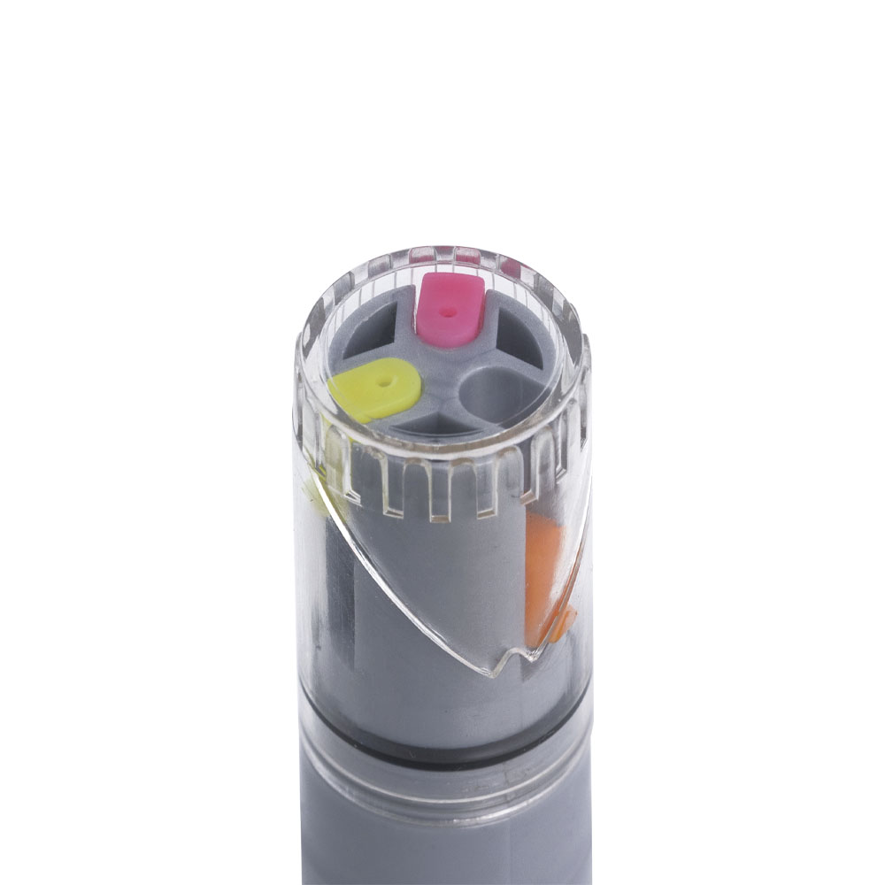 A caneta marca-texto Gyre Três Cores da BRW possui ponta chanfrada de poliéster de 3,0 mm que permite traços finos e grossos. A tinta é à base de água. É o primeiro marca-texto com três pontas no mercado nacional. São três cores neon no mesmo produto: amarelo, rosa e laranja.