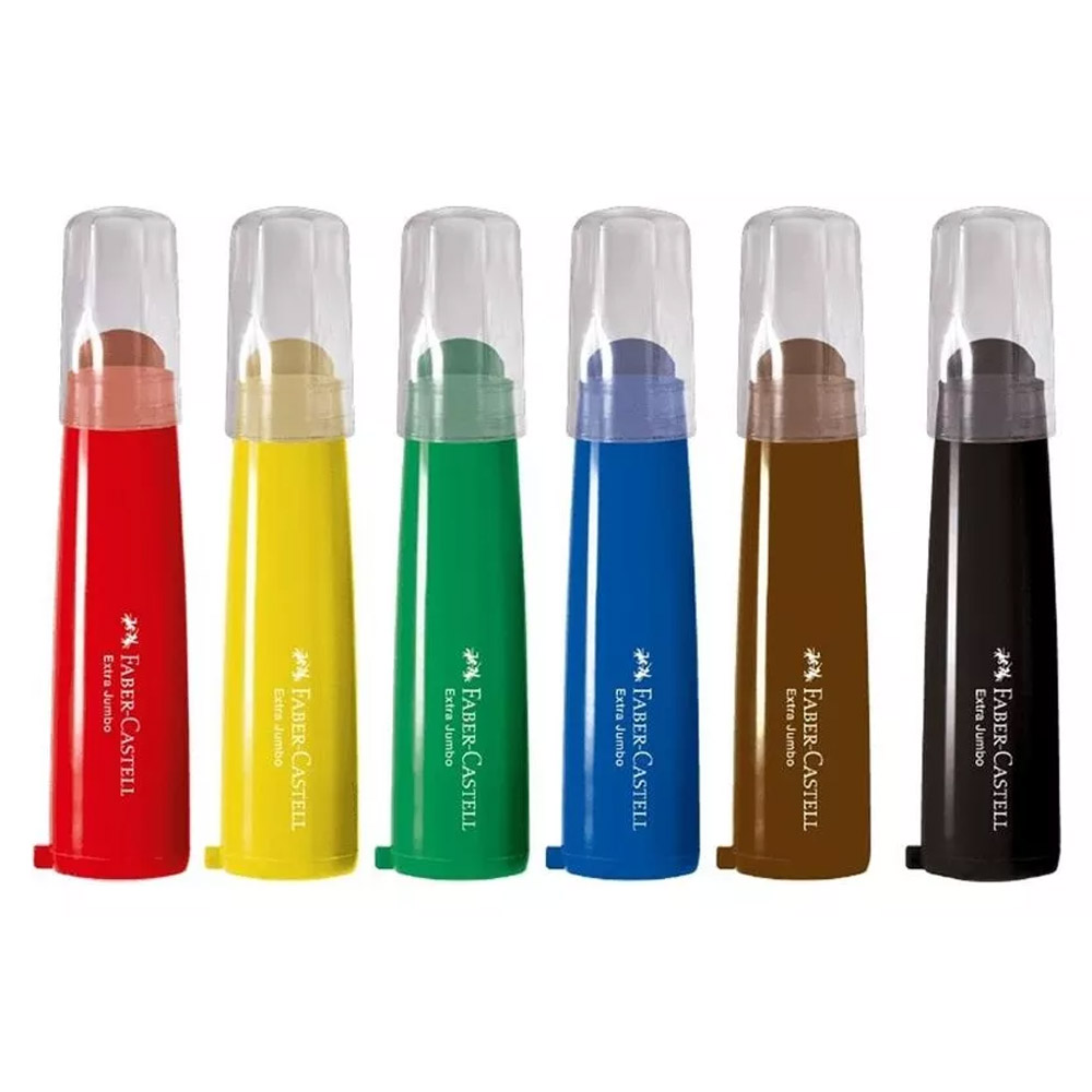 6 Canetas em tons padrão Corpo ergonômico Extra Jumbo ideal para aderência palmar Ponta resistente à pressão. Tinta lavável para mãos e roupas, à base de água e corante alimentar. Com uma pequena barbatana na base especialmente desenhada para que o marcador não role na mesa. Escrever, pintar, marcar ou desenhar em papel, papelão, madeira, etc.