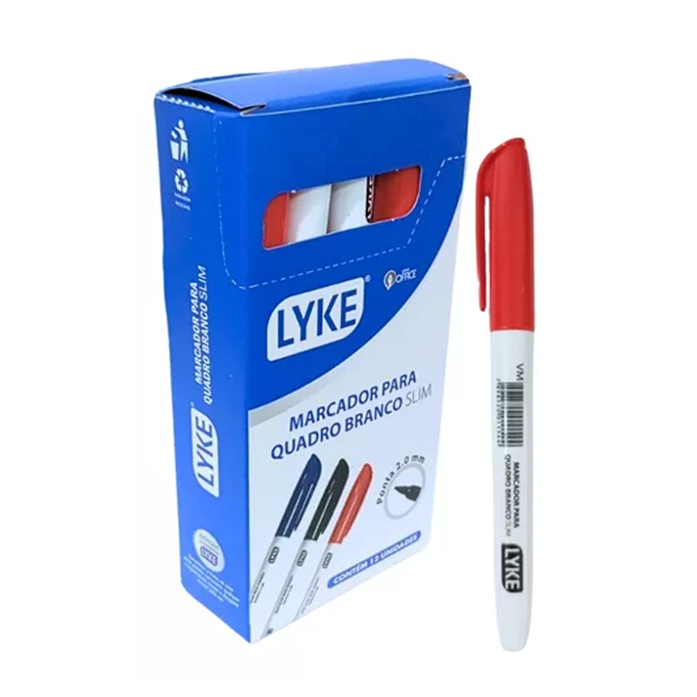 Marcador para Quadro Branco, Modelo Slim, LYKE, Na cor Vermelho, possui sua ponta redonda que proporciona melhores traços e visibilidade quando utilizado em grandes espaços. É ideal para uso didático e apresentações.