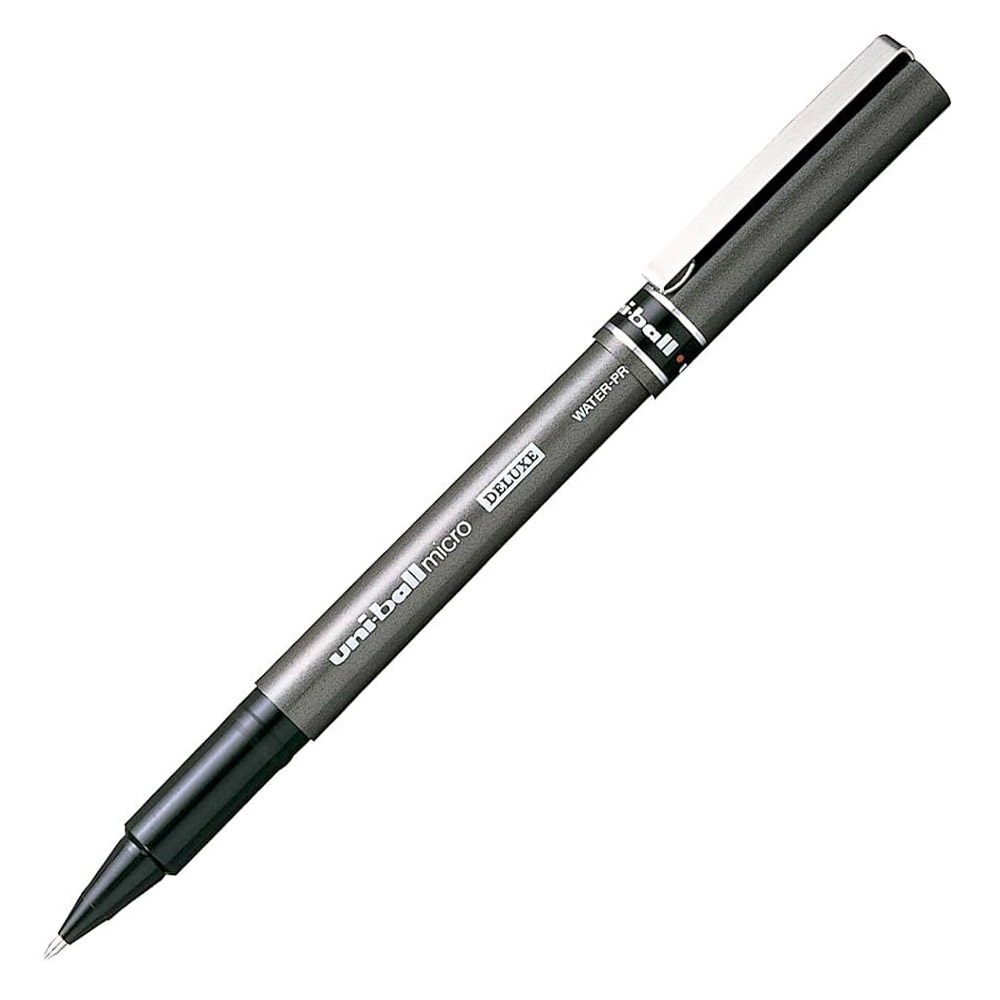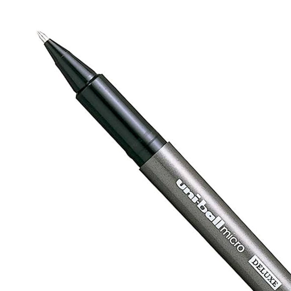 Caneta rolleball, deluxe micro ub 155, 0, 5mm preto blister com 1 unidade. Caneta rollerball com ponta de aço tungstênio que permite uma escrita rápida e menor atrito sobre o papel. Topo e ponta da caneta na cor da tinta. Ub 155 micro: 0, 5mm.