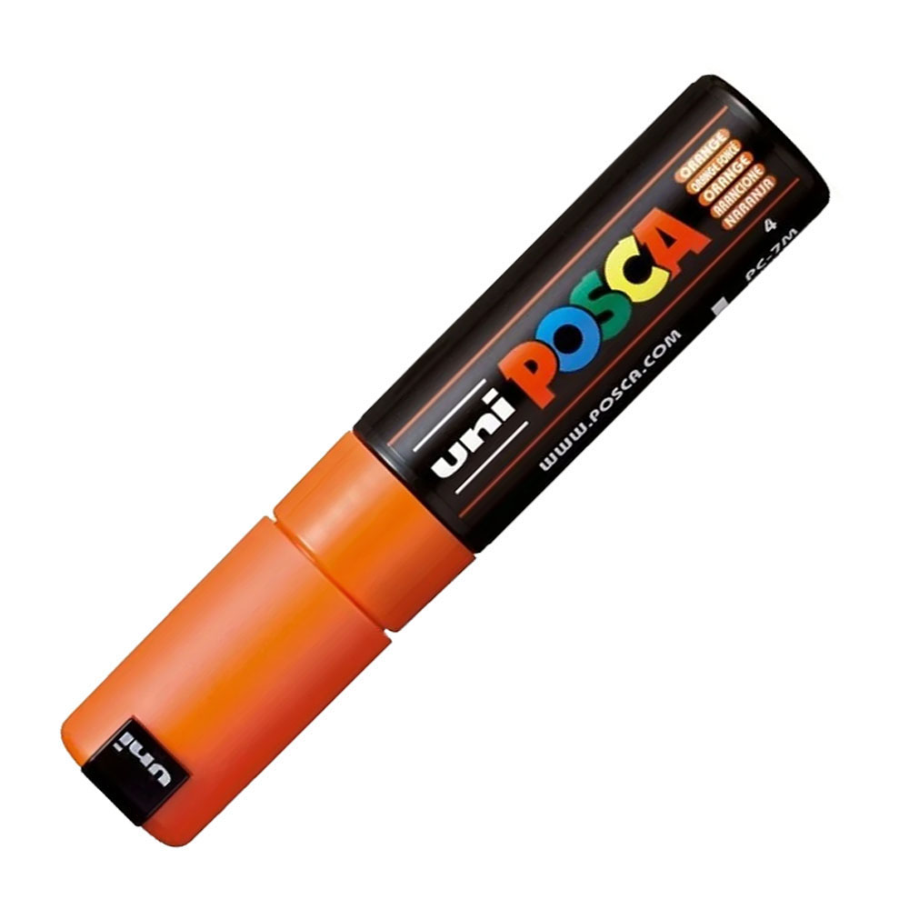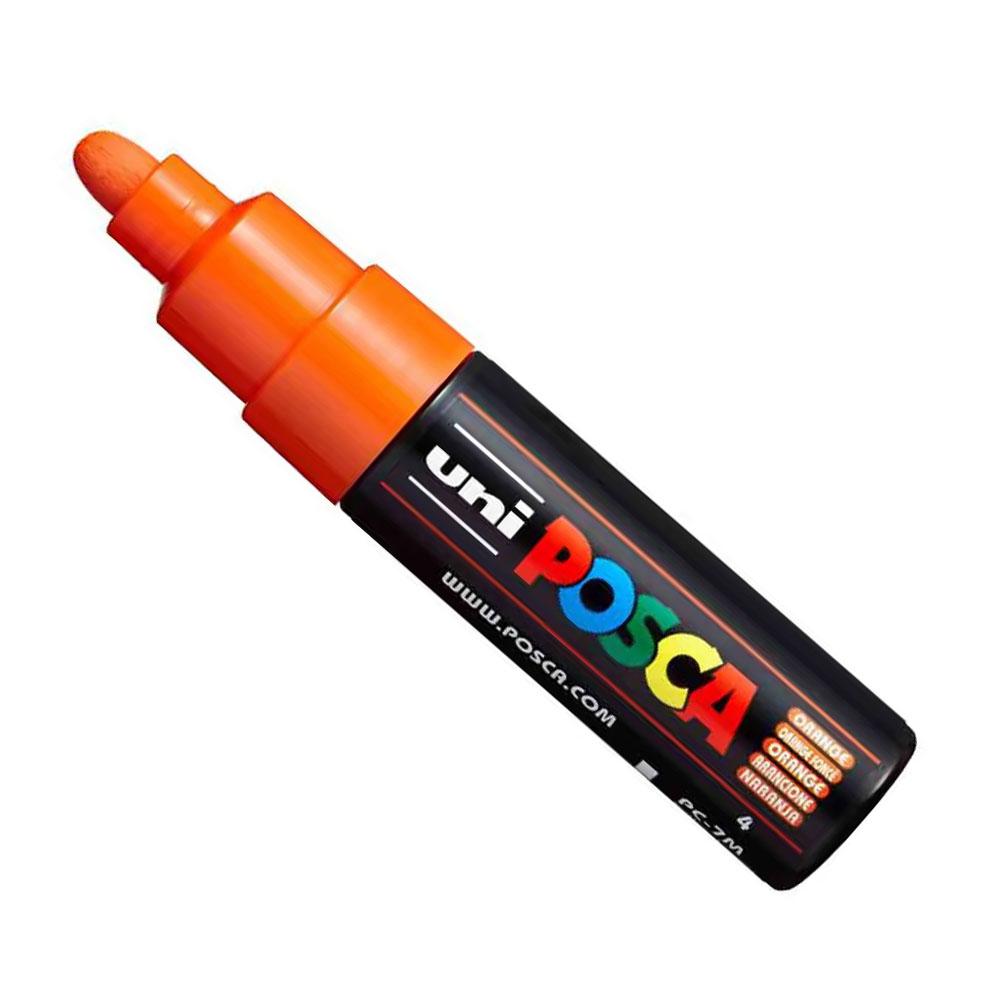 Caneta Marcador Uni Posca PC-7M Laranja 4.5 – 5.5mm, Caneta a base d´água, assim não sendo uma caneta permanente. É possível ter um efeito bastante duradouro em superfícies porosas e/ou ao aplicar uma camada de verniz em spray por cima da arte completa, mas, ainda assim, sempre sugerimos que utilize em objetos decorativos e que não precisem ser lavados com frequência.