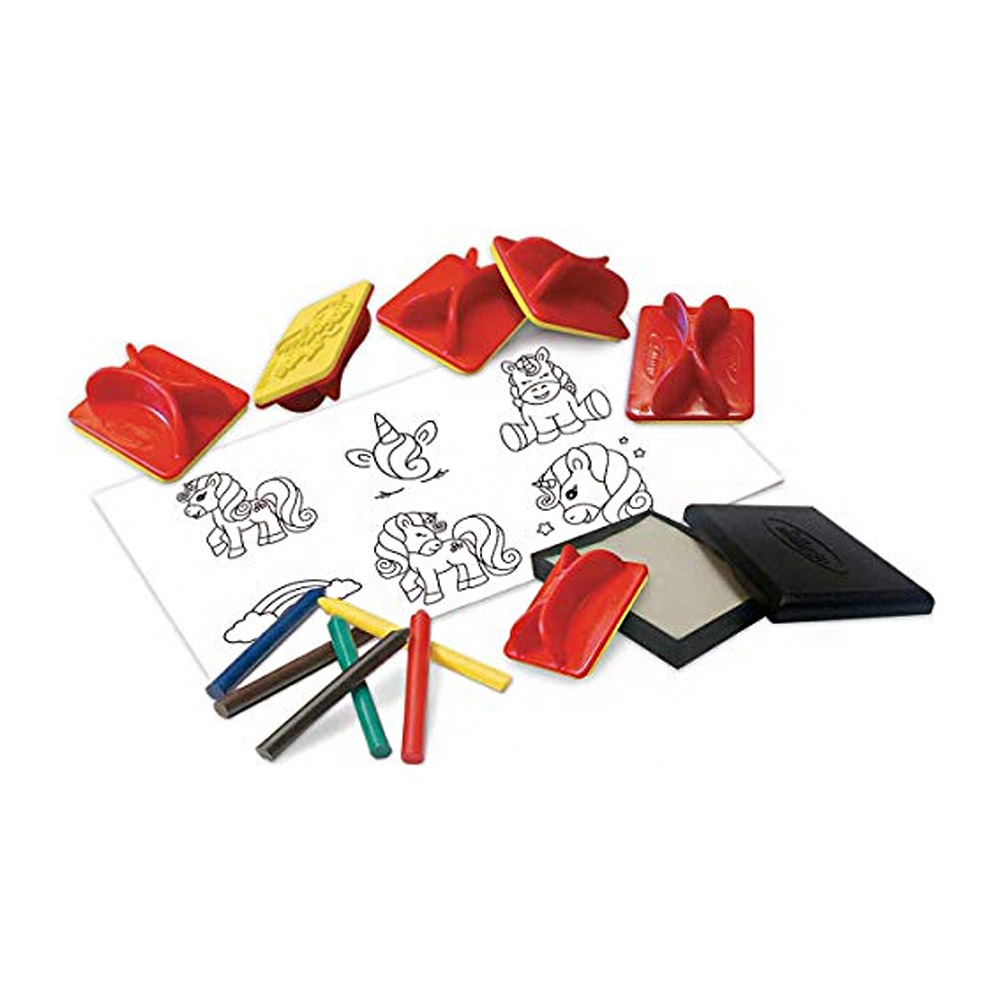 Carimbar é muito divertido, ainda mais em boa companhia. O conjunto de carimbos Unicórnio traz vários modelos, é um produto educativo com 6 carimbos diferentes, de cabo plástico e borracha atóxica. Acompanha bloco de papel e giz de cera para colorir as imagens carimbadas durante a brincadeira.