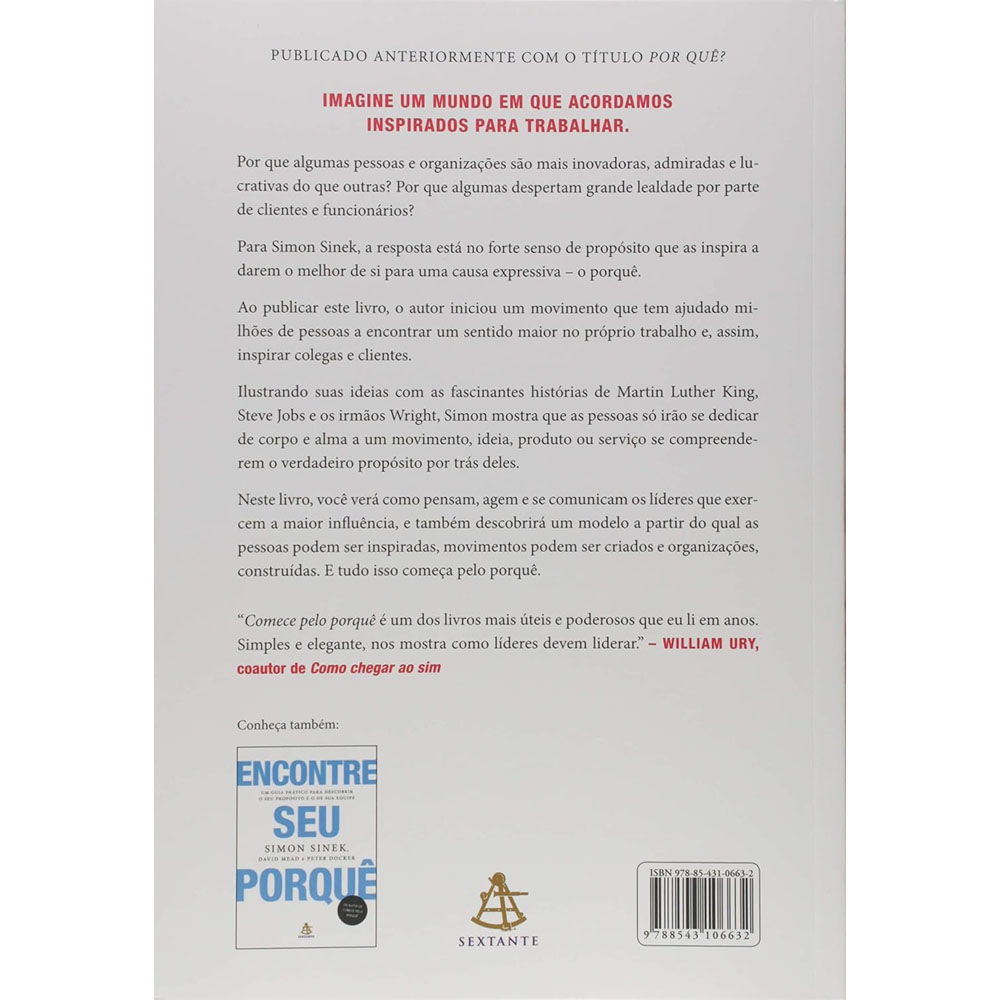 Por que algumas pessoas e organizações são mais inovadoras, admiradas e lucrativas do que outras? Por que algumas despertam grande lealdade por parte de clientes e funcionários? Para Simon Sinek, a resposta está no forte senso de propósito que as inspira a darem o melhor de si para uma causa expressiva – o porquê. Ao publicar esse livro, o autor iniciou um movimento que tem ajudado milhões de pessoas a encontrar um sentido maior no próprio trabalho e, assim, inspirar colegas e clientes. Ilustrando suas ideias com as fascinantes histórias de Martin Luther King, Steve Jobs e os irmãos Wright, Simon mostra que as pessoas só irão se dedicar de corpo e alma a um movimento, ideia, produto ou serviço se compreenderem o verdadeiro propósito por trás deles. Nesse livro, você verá como pensam, agem e se comunicam os líderes que exercem a maior influência, e também descobrirá um modelo a partir do qual as pessoas podem ser inspiradas, movimentos podem ser criados e organizações, construídas. E tudo isso começa pelo porquê.