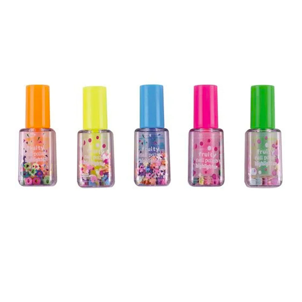 Os marca textos mais fofos em formato de esmalte. Cores fluorescente que destacam as suas anotações! – Ponta chanfrada, sendo duas opções de traços, fino e grosso – Marca texto super macio – Contém 5 cores: azul, verde, rosa, laranja e amarelo