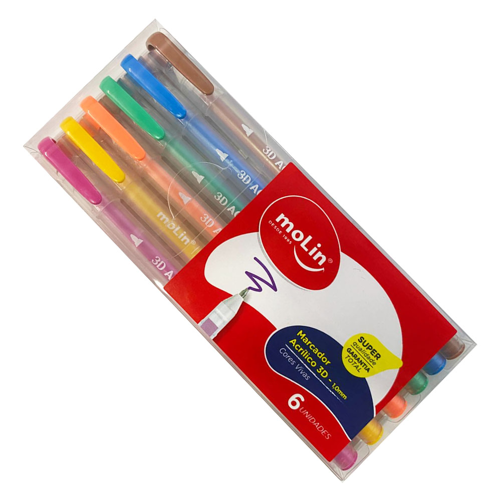 Caneta Marcador Acrílico 3D 1.0mm c/ 6 Cores Vibrantes Molin