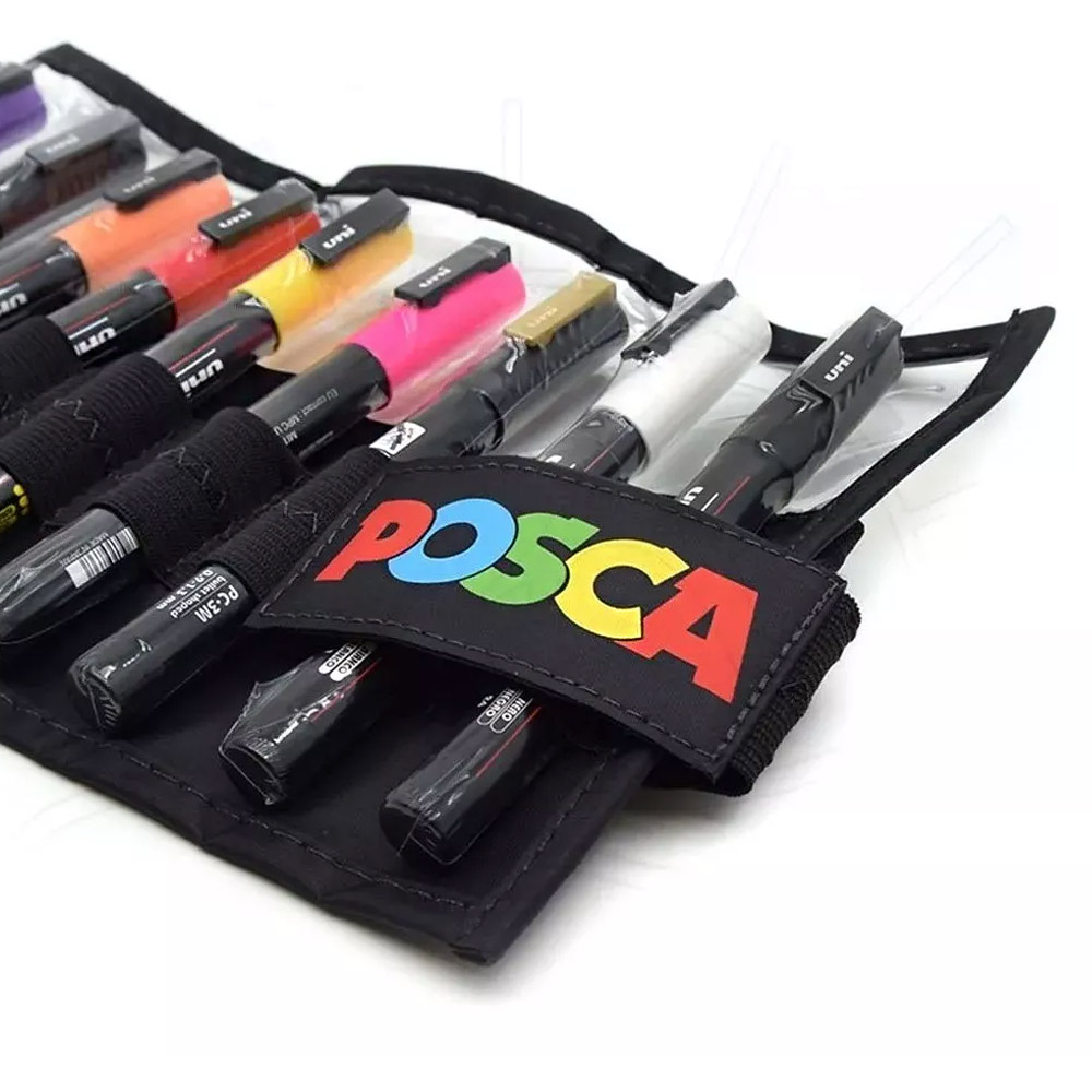 Kit Estojo com 12 cores ponta fina Marcador POSCA PC-3M 12 unidades Ficha técnica: Cores que vem neste kit estojo: verde, marrom, azul, violeta, prata, laranja claro, vermelho, amarelo, rosa, ouro dourado, branco e preto.