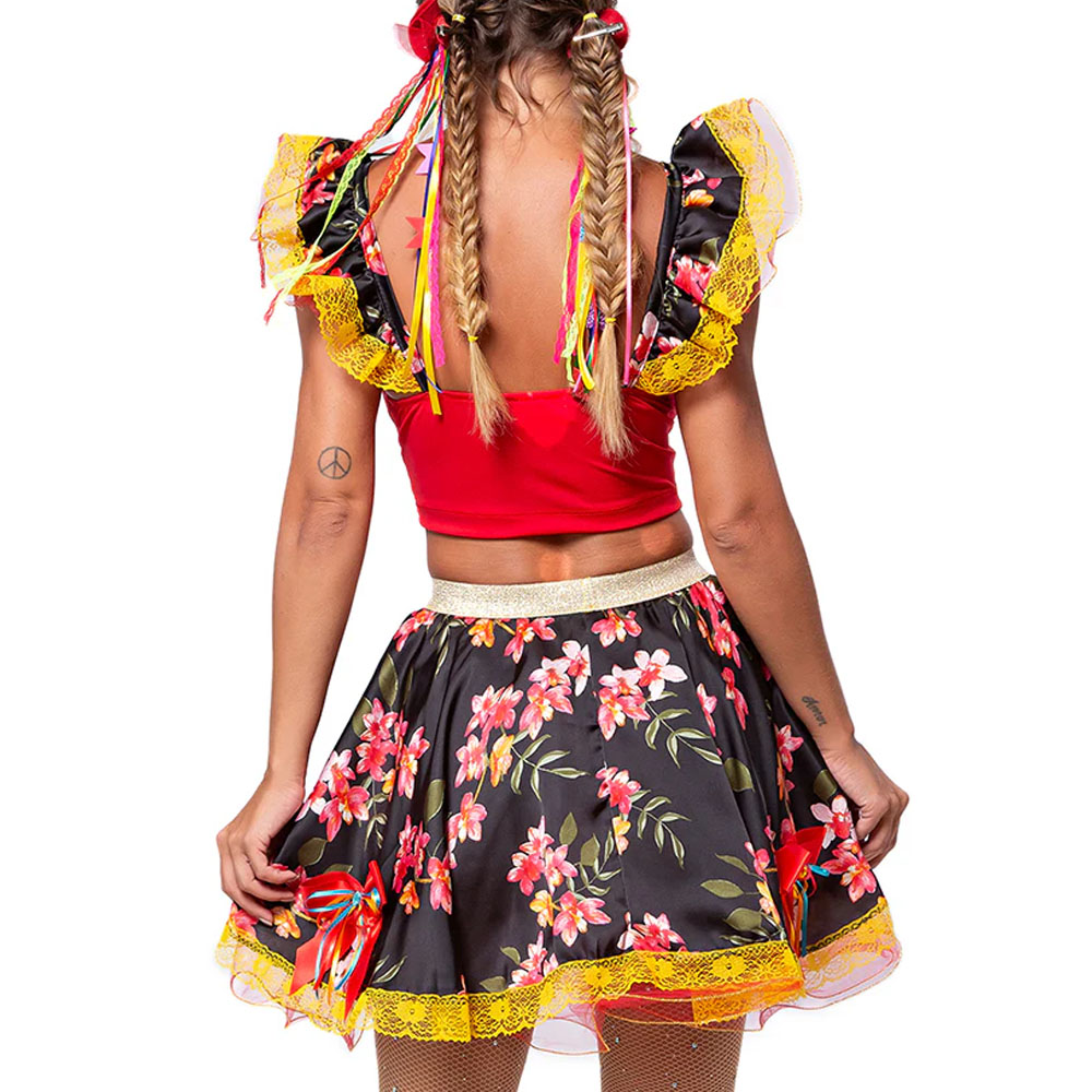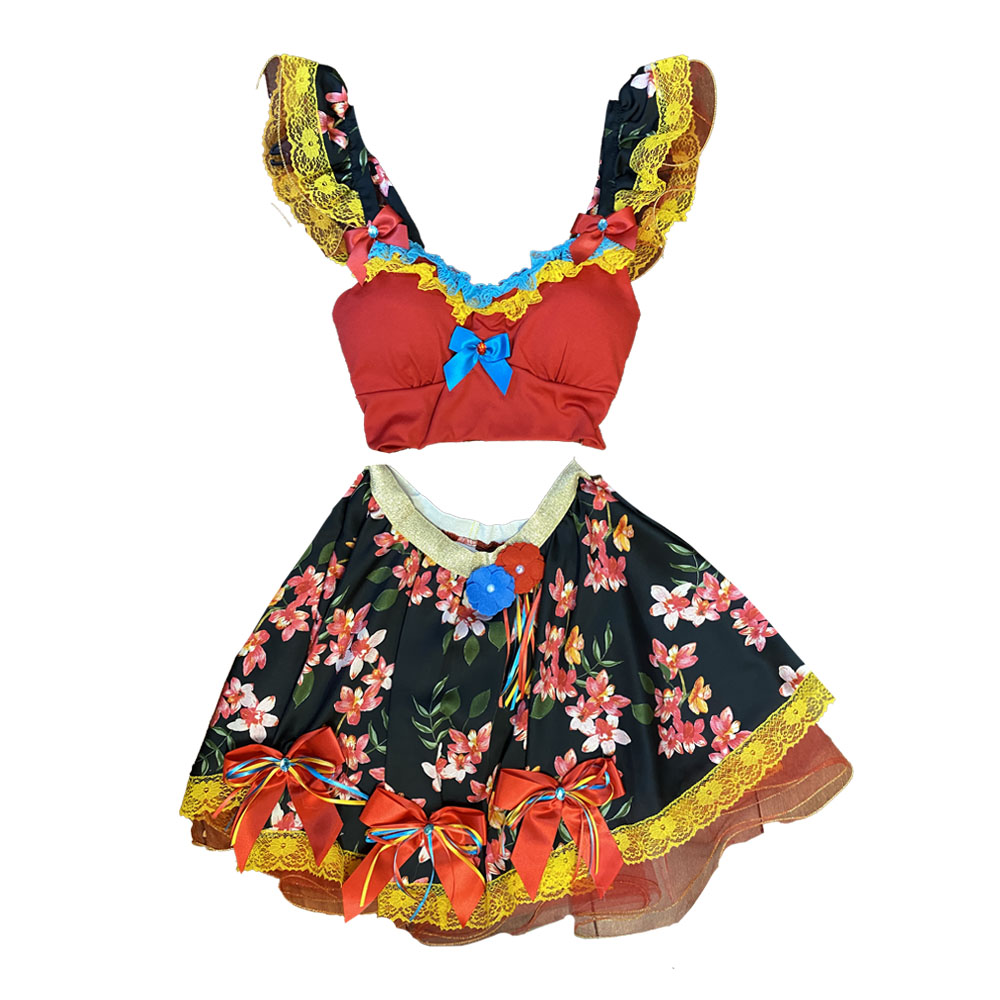 A linha caipira luxo é composta por um conjunto elegante, com saia e cropped. O cropped apresenta rendas e laços de cetim no decote. A saia tem elástico na cintura, laços de cetim com fitas coloridas e barra com renda e tule.