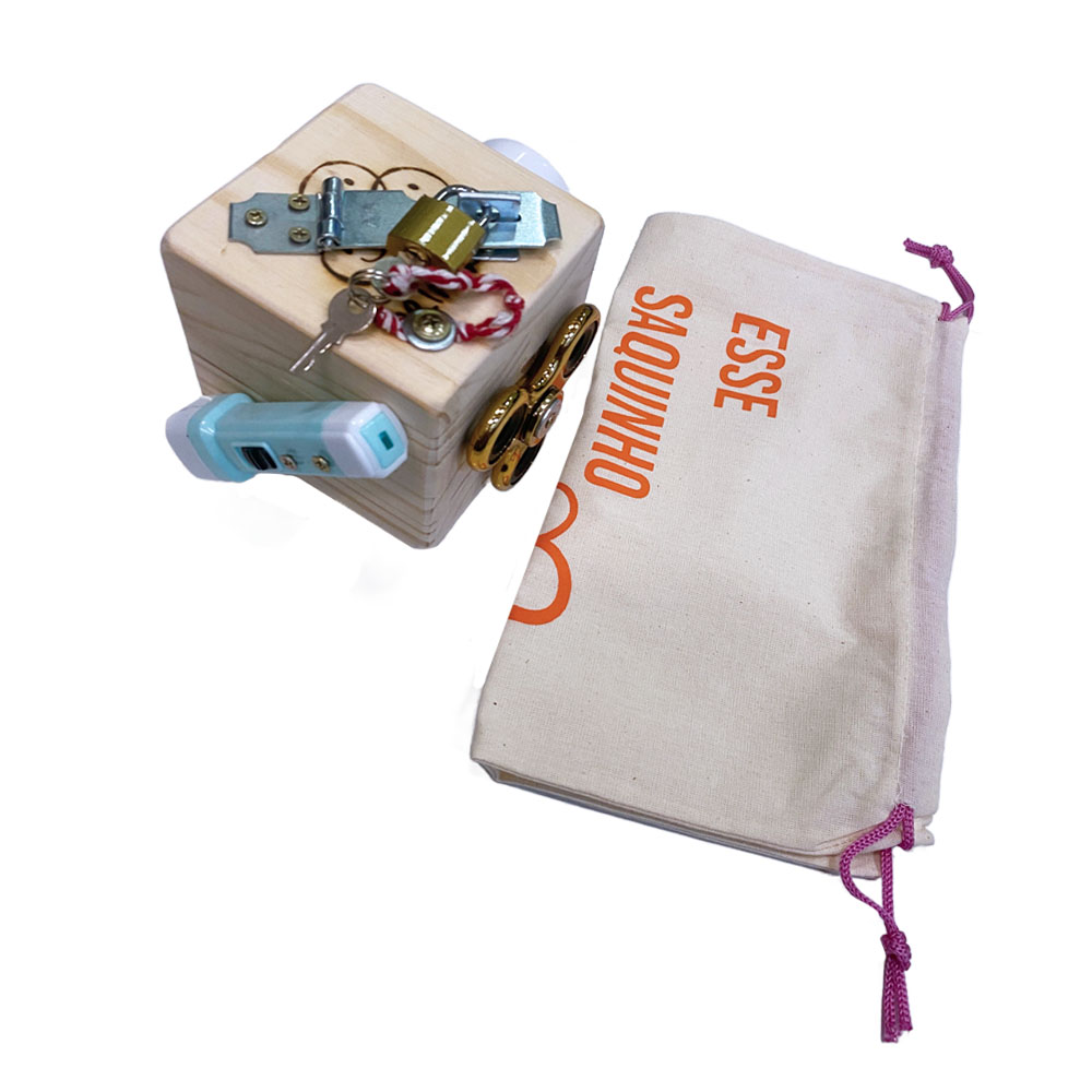 Chegou o maravilhoso cubo em madeira da Brincriarte; Com ele, seus pequenos poderão curtir 6 (seis) das melhores atividades sensoriais em busyboard que a Brincriarte oferece, todas escolhidas à mão; Trata-se de um cubo portátil que poderá ser levado facilmente para qualquer lugar, com a ajuda de uma sacolinha em algodão personalizada Brincriarte; Podemos dizer que também trata-se de uma atividade de busybag.
