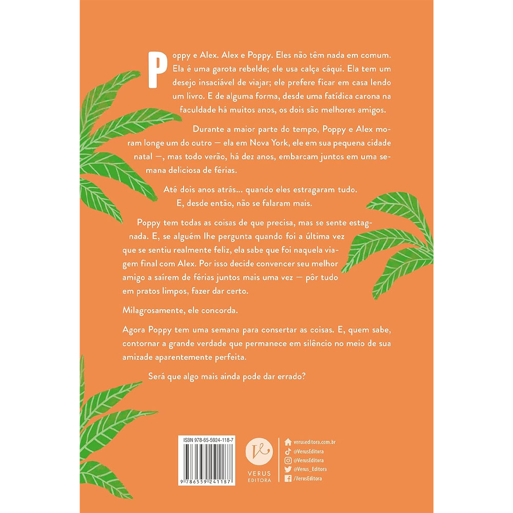 Poppy e Alex. Alex e Poppy. Eles não têm nada em comum. Ela é uma garota rebelde; ele usa calça cáqui. Ela tem um desejo insaciável de viajar; ele prefere ficar em casa lendo um livro. E de alguma forma, desde uma fatídica carona na faculdade há muitos anos, os dois são melhores amigos. Durante a maior parte do tempo, Poppy e Alex moram longe um do outro – ela em Nova York, ele em sua pequena cidade natal -, mas todo verão, há dez anos, embarcam juntos em uma semana deliciosa de férias. Até dois anos atrás… quando eles estragaram tudo. E, desde então, não se falaram mais. Poppy tem todas as coisas de que precisa, mas se sente estagnada. E, se alguém lhe pergunta quando foi a última vez que se sentiu realmente feliz, ela sabe que foi naquela viagem final com Alex. Por isso decide convencer seu melhor amigo a saírem de férias juntos mais uma vez – pôr tudo em pratos limpos, fazer dar certo. Milagrosamente, ele concorda. Agora Poppy tem uma semana para consertar as coisas. E, quem sabe, contornar a grande verdade que permanece em silêncio no meio de sua amizade aparentemente perfeita. Será que algo mais ainda pode dar errado?