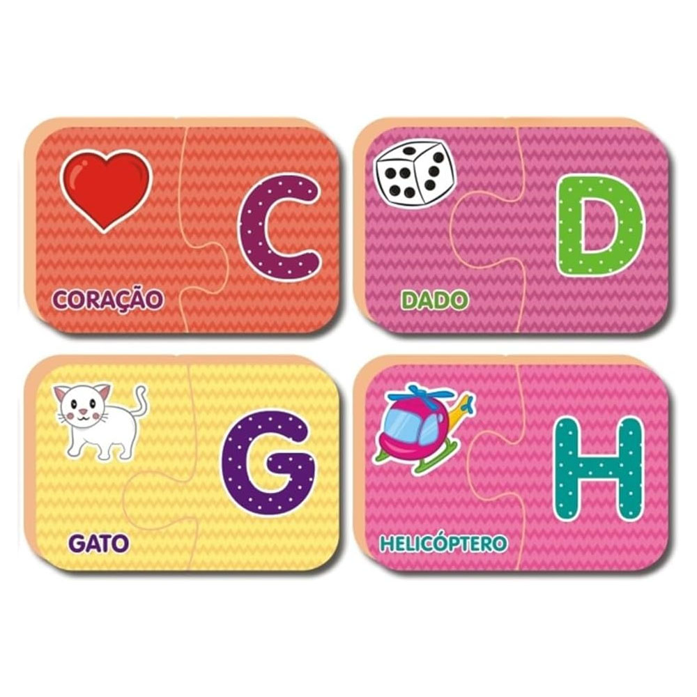 “Material didático para crianças em fase pré-escolar; indicado nas listas de material das escolas. Esse jogo traz a associação de cada letra do alfabeto ao objeto que começa com a mesma letra. Encaixes diferentes. Contém 52 peças grandes em madeira reciclada, coloridas e resistentes. INMETRO NM 300/2002 Não recomendado para menores de 3 anos de idade”