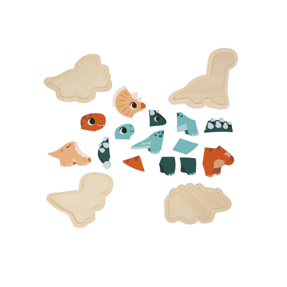 Comece com o quebra-cabeça de 2 peças e aumente gradualmente a dificuldade, até o modelo de 5 peças. Vamos trazer o Triceratops de 2 peças, o T-Rex de 3 peças, o Diplodocus de 4 peças e o Ankylosaurus de 5 peças de volta à vida. Para tornar este jogo infantil ainda mais fácil, as peças do quebra-cabeça de madeira se aninham em 4 bases.