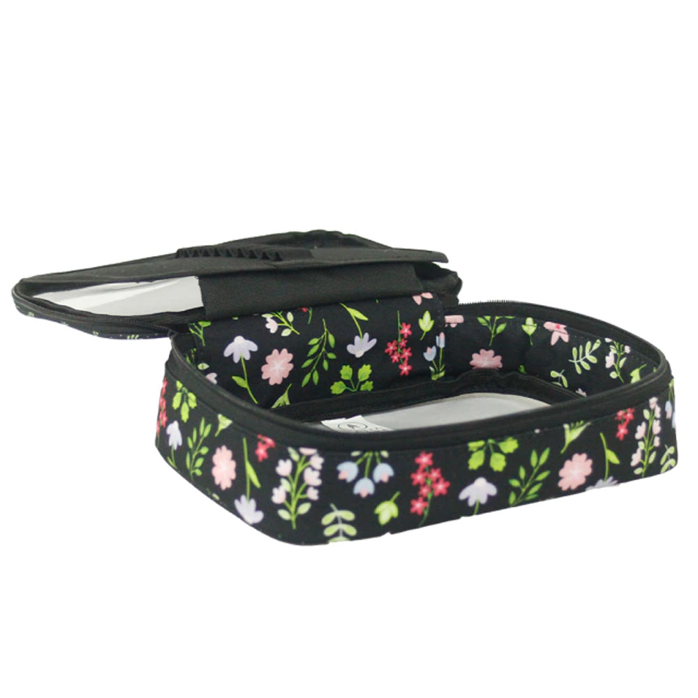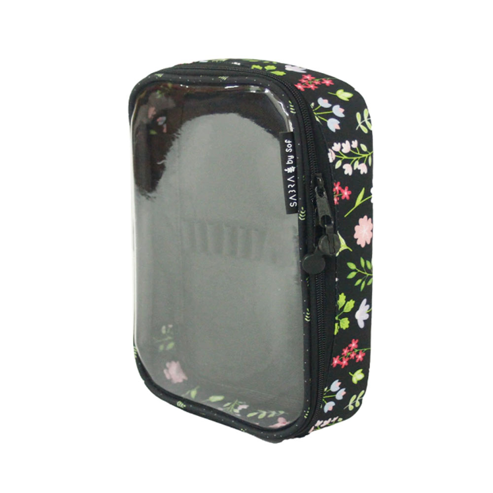 Confeccionado em poliéster estampado, o estojo é durável e resistente. A estampa foi criada em conjunto entre a Sabra e a Sof Martins, garantindo um toque único e elegante.