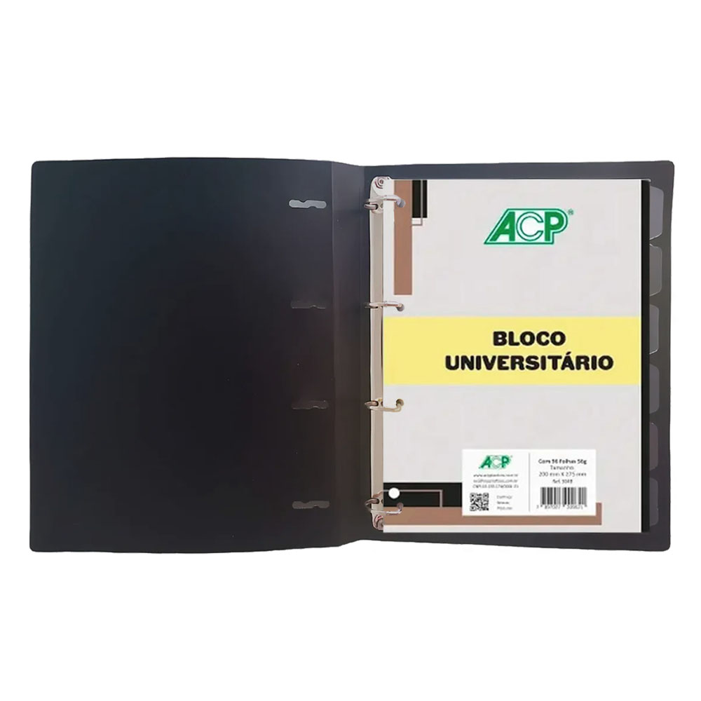 Fichário Universitário Sweet com Capa de PP, com 4 argolas, bloco de 96 folhas e 6 divisórias coloridas.