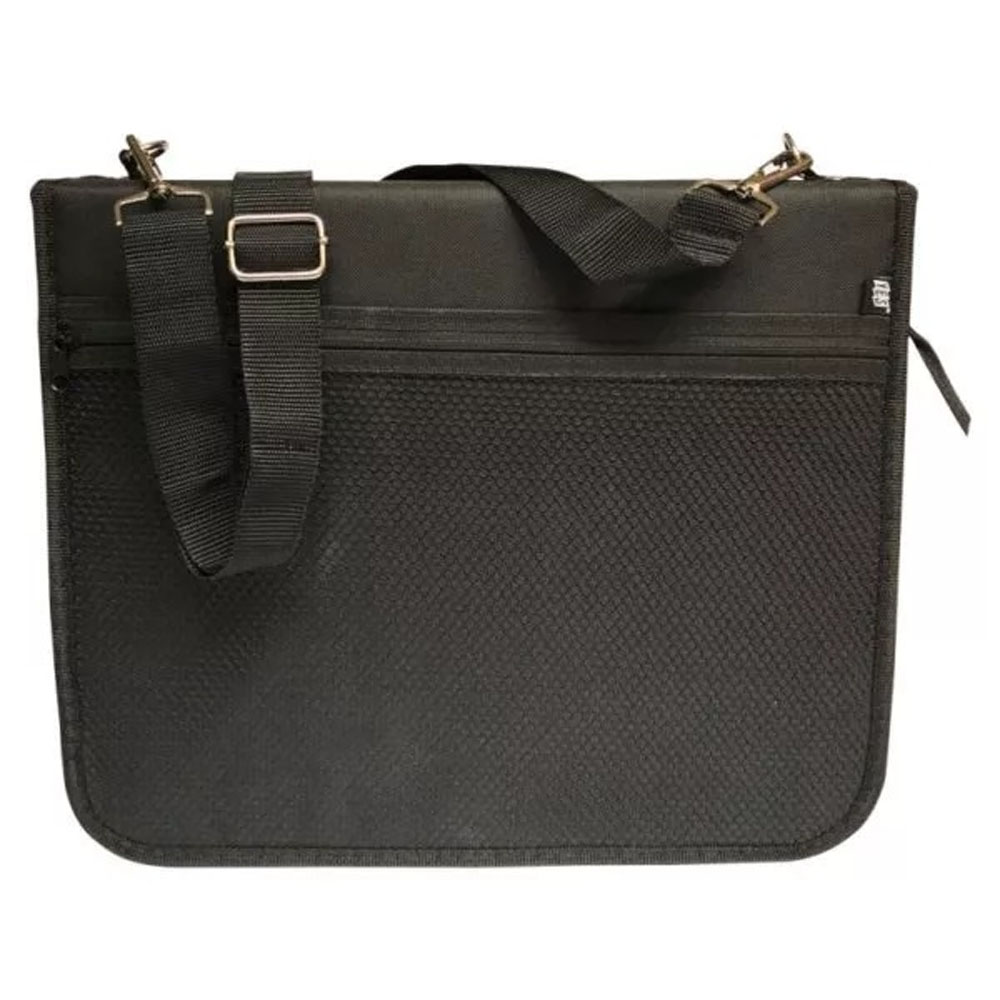 – Características: Fichário em tecido com alça regulável e removível, zíper e 4 argolas. Possui 1 bolso telado interno, 1 externo, porta cartões, porta caneta, 3 bolsos internos e 1 divisória.
