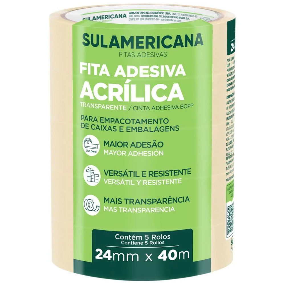 Fita adesiva Sulamericana 24mm x 40m ideal para aplicações diversas em escritórios papelarias embalagens e uso doméstico fabricada com adesivo de alta performance que garante excelente fixação e durabilidade rolo com 40 metros de comprimento oferecendo ótimo rendimento largura de 24mm e praticidade no dia a dia produto confiável da marca Sulamericana referência em soluções adesivas.