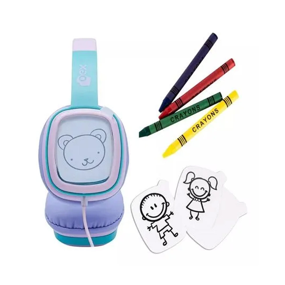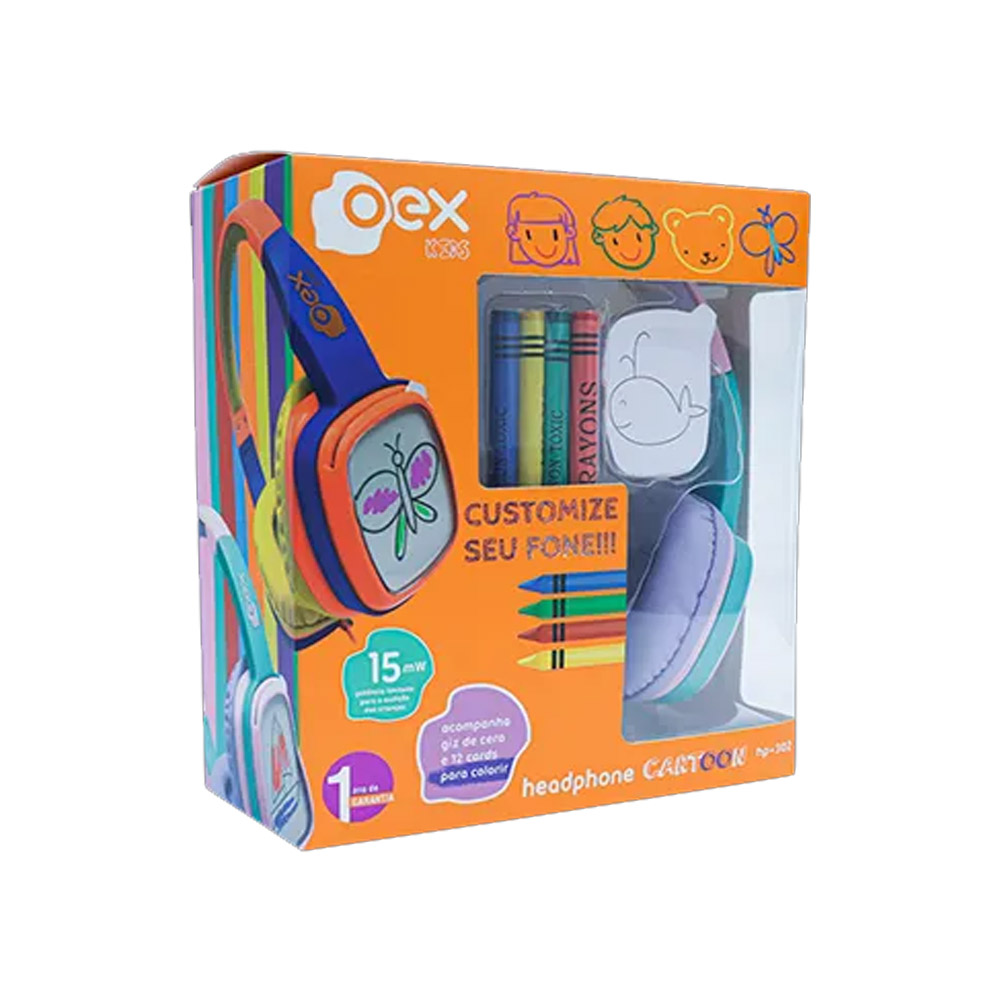 Customize seu fone! O Headphone Cartoon acompanha 12 cards (4 ilustrados e 8 em branco) e giz de cera em 4 cores para customizar o fone.